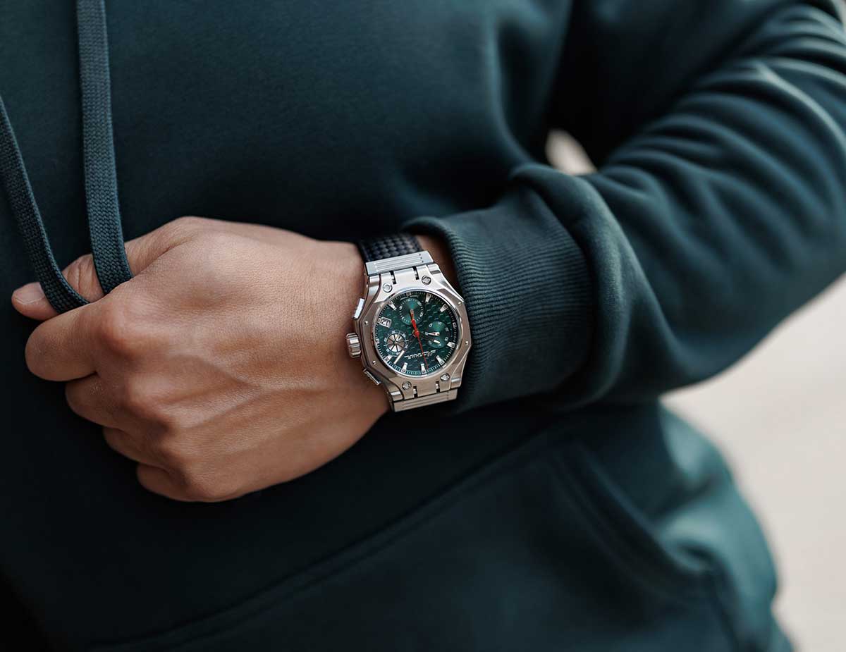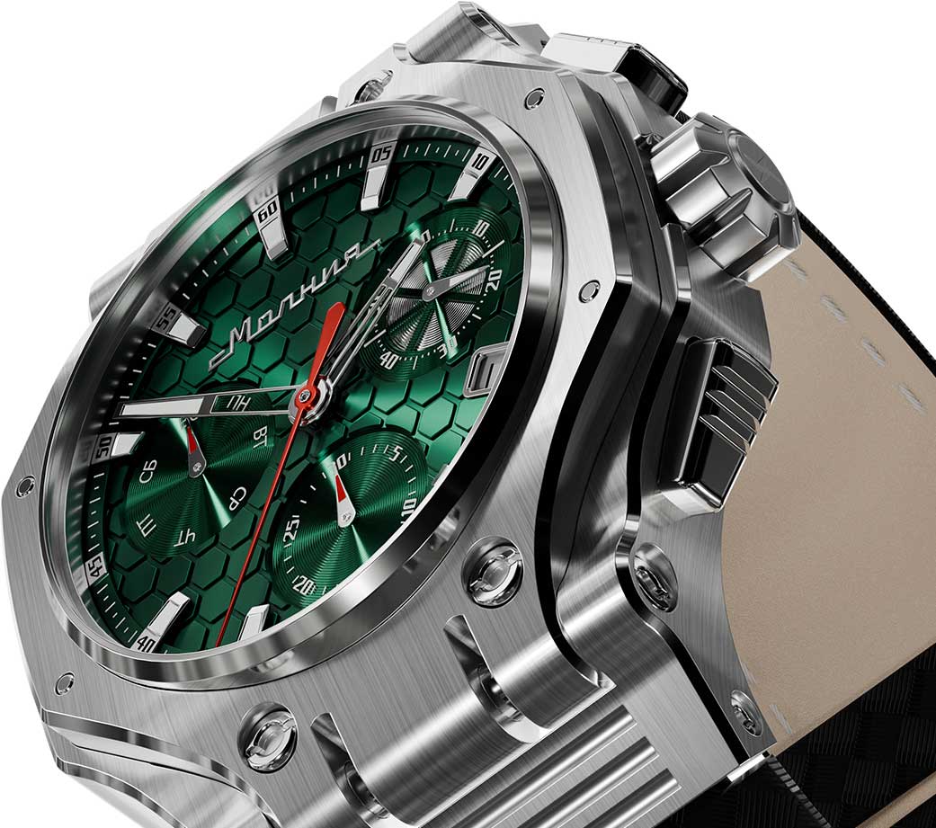 Эффектный и функциональный хронограф без сомнений будет идеально смотреться на сильном мужском запястье. Hyron. Модель создана в коллаборации с дизайнером часов Йоргом Хайзеком. Стальной корпус сконструирован в форме профиля башни танка Т-90. Часы-хронограф с секундомером. Секундомер с временем измерения 30мин. Секундная стрелка вынесена на отдельный циферблат. Циферблат выполнен по технологии Sunray (солнечные лучи) и защищен прочным сапфировым стеклом толщиной 2мм. Метки и стрелки с люминесцентным покрытием SuperLuminova, которое светится в темноте после непродолжительной зарядки на свету. Окошко даты находится в положении 4 часа. День недели вынесен на отдельный циферблат. Задняя крышка крепится на 8-ми винтах. Карбоновый ремешок с классической застежкой. Производитель оставляет за собой право вносить изменения во внешний вид часов. При заказе уточняйте у менеджера выбранный вариант.