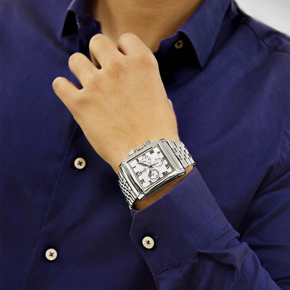 Премиальный аксессуар подчеркнет эстетику образа и статус преуспевающего делового мужчины. Обновленный дизайн популярной коллекции Celebrity. Респектабельные часы-хронограф с секундомером. Квадратный корпус из серебра. Двухуровневый циферблат с текстурной центральной частью защищен минеральным стеклом. Метки в виде римских цифр. Окошко даты находится в положении 12 часов. Рифленая заводная головка. Утяжеленный серебряный браслет не перекручивается и не деформируется, а благодаря его широким звеньям часы плотно и четко прилегают к руке. Производитель оставляет за собой право вносить изменения во внешний вид часов.