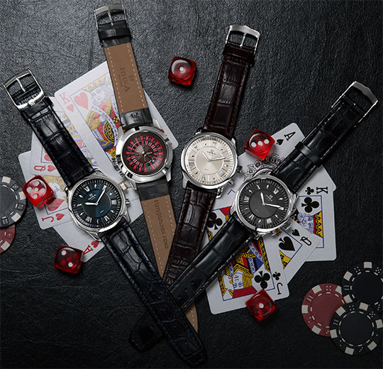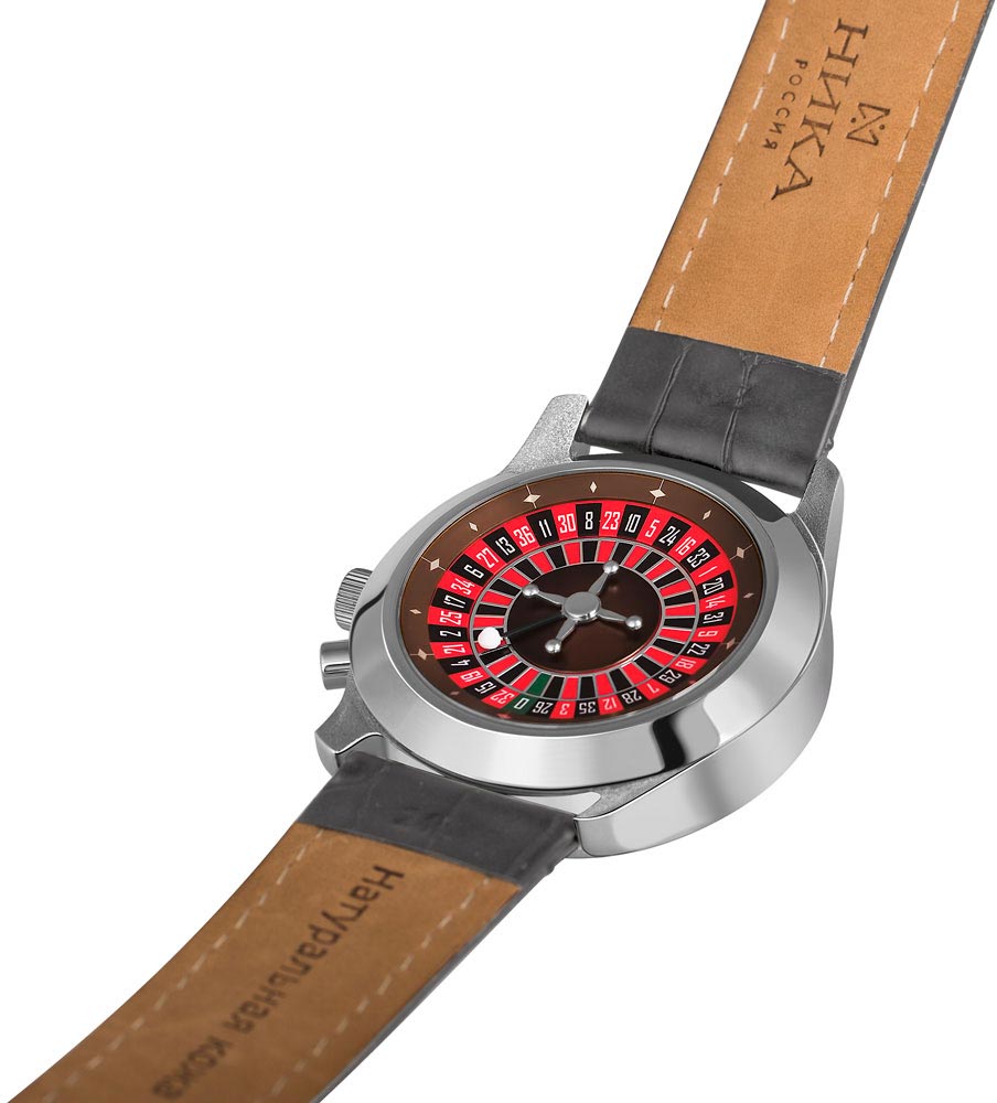 Безукоризненный стиль и отличное качество превратят эти часы в ваш любимый аксессуар. Время лидера. Казино. Задняя крышка с минеральным стеклом, под которым находится рулетка - 36 ячеек красного и черного цветов, зеленый нулевой слот и судьбоносный шарик. Чтобы запустить рулетку, нажмите на дополнительную кнопку под заводной головкой. Производитель оставляет за собой право вносить изменения во внешний вид часов.