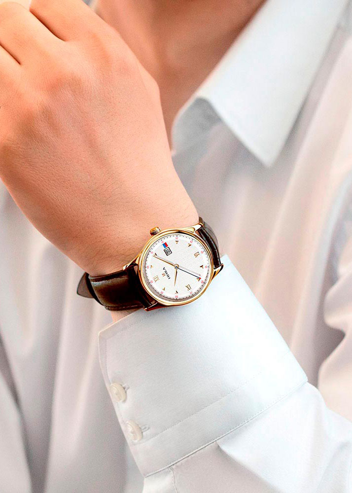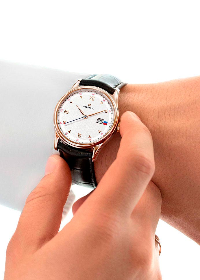 Мужские кварцевые наручные часы .RU. Круглый полированный корпус из красного золота 585 пробы. Циферблат выполнен по технологии направленной шлифовки и украшен логотипом бренда. Накладные метки в виде римских цифр и объемных делений гармонично сочетаются с акцентными красными метками. Острые стрелки в стиле Alpha. Окошко даты находится в положении 3 часа. Объемный накладной знак в виде флага России символизирует единство человека, дела и страны. Рифленая заводная головка. Задняя крышка украшена гильограммой ''NIKA''. Ремешок из натуральной матовой кожи с декоративной прошивкой. Раскладывающаяся застежка.