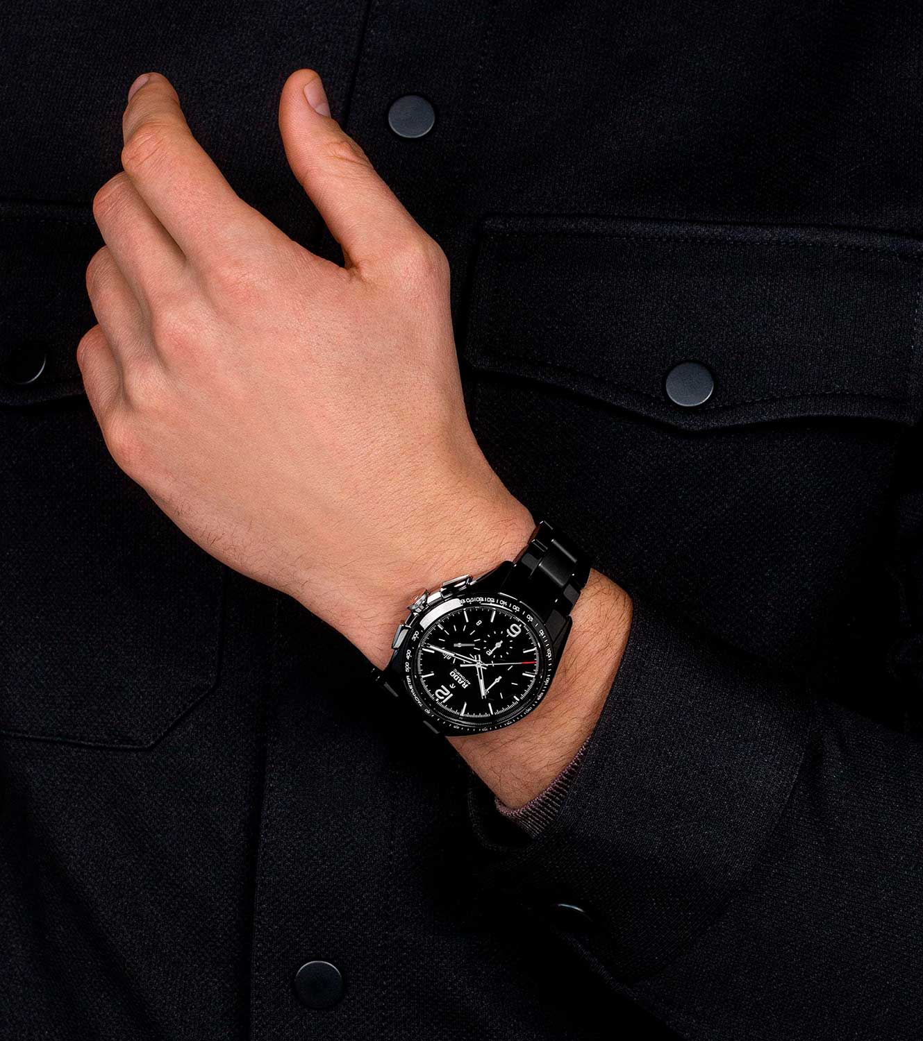 Динамичные, элегантные и многофункциональные часы будут удачно смотреться как с деловым костюмом, так и с повседневной одеждой. Мужские наручные часы-хронограф с секундомером и тахиметром HyperChrome Automatic Chronograph. Круглый керамический корпус c гладкой поверхностью. В механизме 37 камней. Запас хода 42 часа. Сатинированный циферблат. Накладные метки в виде штрихов и арабских цифр. Прямоугольные стрелки в стиле Baton. Метки и стрелки с люминесцентным покрытием, которое светится в темноте после непродолжительной зарядки на свету. Окошко даты находится между часовыми отметками 4 и 5. Рифленая заводная головка с защитой. Надежный керамический браслет с раскладывающейся титановой застежкой.