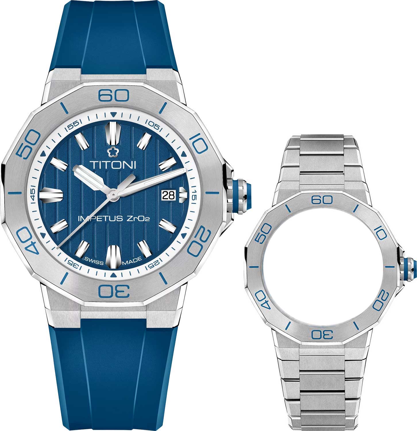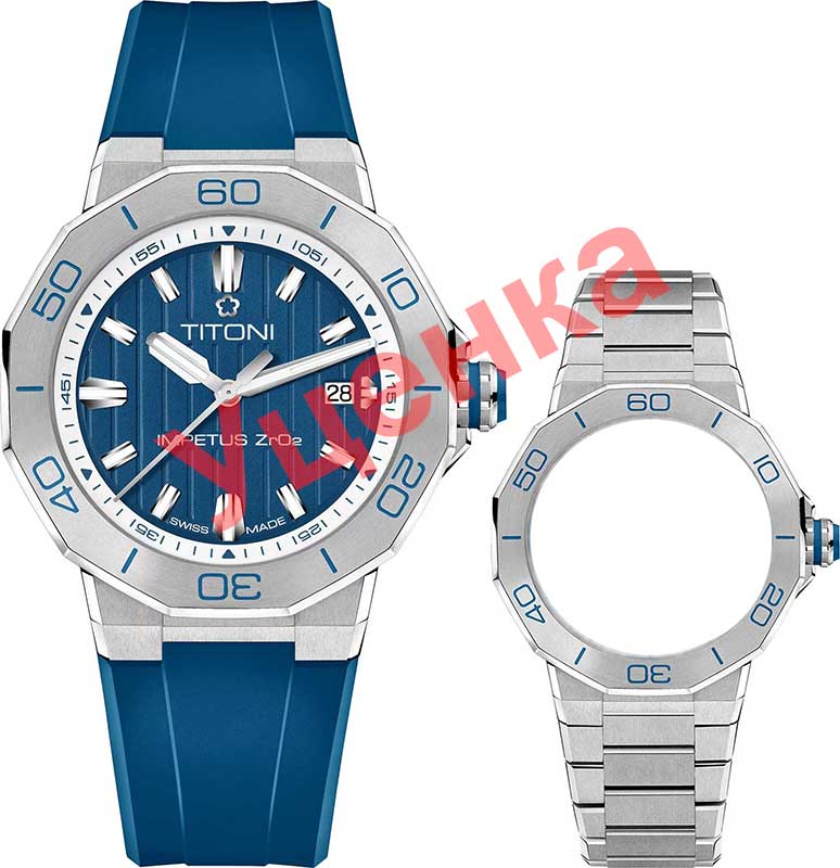 Мужские часы. В механизме 21 камень. Запас хода 44 часа. Ротор с позолотой 18К украшен надписью Titoni. Круглый корпус выполнен из керамики и стали. Циферблат с метками в виде штрихов защищен прочным сапфировым стеклом. Двухстороннее антибликовое покрытие стекла обеспечивает максимальное удобство использования этих часов даже в самый солнечный день. Окошко даты находится в положении 3 часа. Заводная головка с керамической вставкой и двойной системой защиты. Прозрачная задняя крышка с сапфировым стеклом. Каучуковый ремешок с раскладывающейся застежкой. Система быстрой замены ремешка. В комплекте сменный стальной браслет.