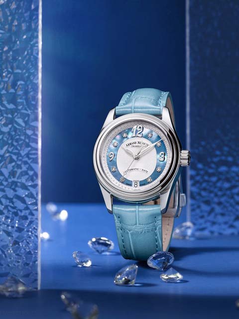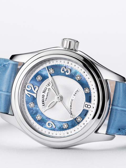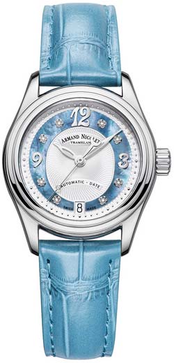 Женские часы. В механизме 26 камней. Запас хода 38 часов. Циферблат часов украшен декоративным узором - гильоше и защищен практичным сапфировым стеклом устойчивым к механическим повреждениям. Накладные метки в виде точек и арабских цифр. Окошко даты находится в положении 6 часов. Завинчивающаяся задняя крышка с сапфировым стеклом. Ремешок с раскладывающейся застежкой.