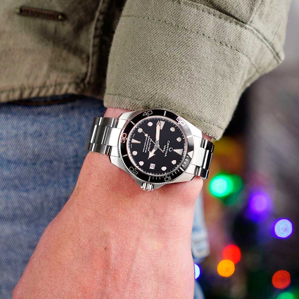 Практичные часы в спортивном дизайне привлекут внимание молодых людей с уверенной жизненной позицией. Спортивные наручные часы унисекс. Запас хода 80 часов. Круглый стальной корпус. Рифленый стальной безель с алюминиевой вставкой. Матовый циферблат. Мечевидные стрелки в стиле Sword. Накладные метки в виде штрихов и точек. Метки и стрелки с люминесцентным покрытием, которое светится в темноте после непродолжительной зарядки на свету. Окошко даты находится в положении 3 часа. Рифленая заводная головка с защитой. Задняя крышка украшена гравировкой. Надежный стальной браслет с раскладывающейся застежкой. Система быстрой замены браслета.