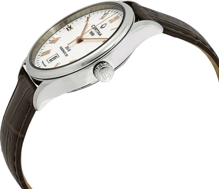 Мужские автоматические наручные часы DS-8 Powermatic 80. Круглый стальной корпус. Матовый циферблат. Накладные метки в виде римских цифр. Заостренные узкие прямоугольные стрелки в стиле Baton. Окошко даты находится в положении 6 часов. Рифленая заводная головка. Прозрачная задняя крышка. Удобный кожаный ремешок с раскладывающейся застежкой.