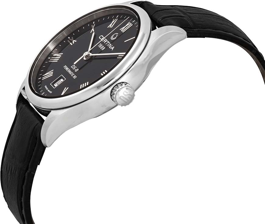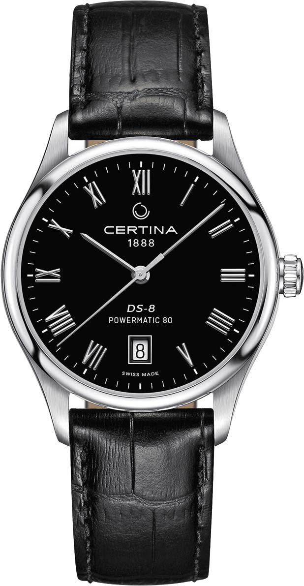 Мужские автоматические наручные часы DS-8 Powermatic 80. Круглый стальной корпус. Матовый циферблат. Накладные метки в виде римских цифр. Заостренные узкие прямоугольные стрелки в стиле Baton. Окошко даты находится в положении 6 часов. Рифленая заводная головка. Прозрачная задняя крышка. Удобный кожаный ремешок с раскладывающейся застежкой.