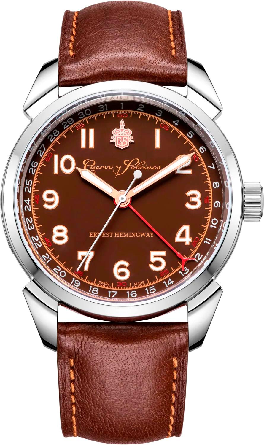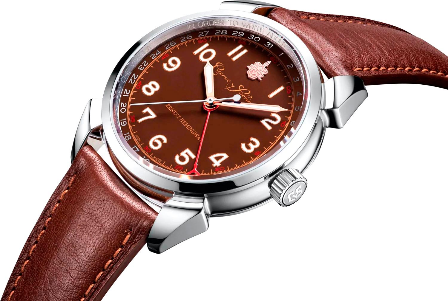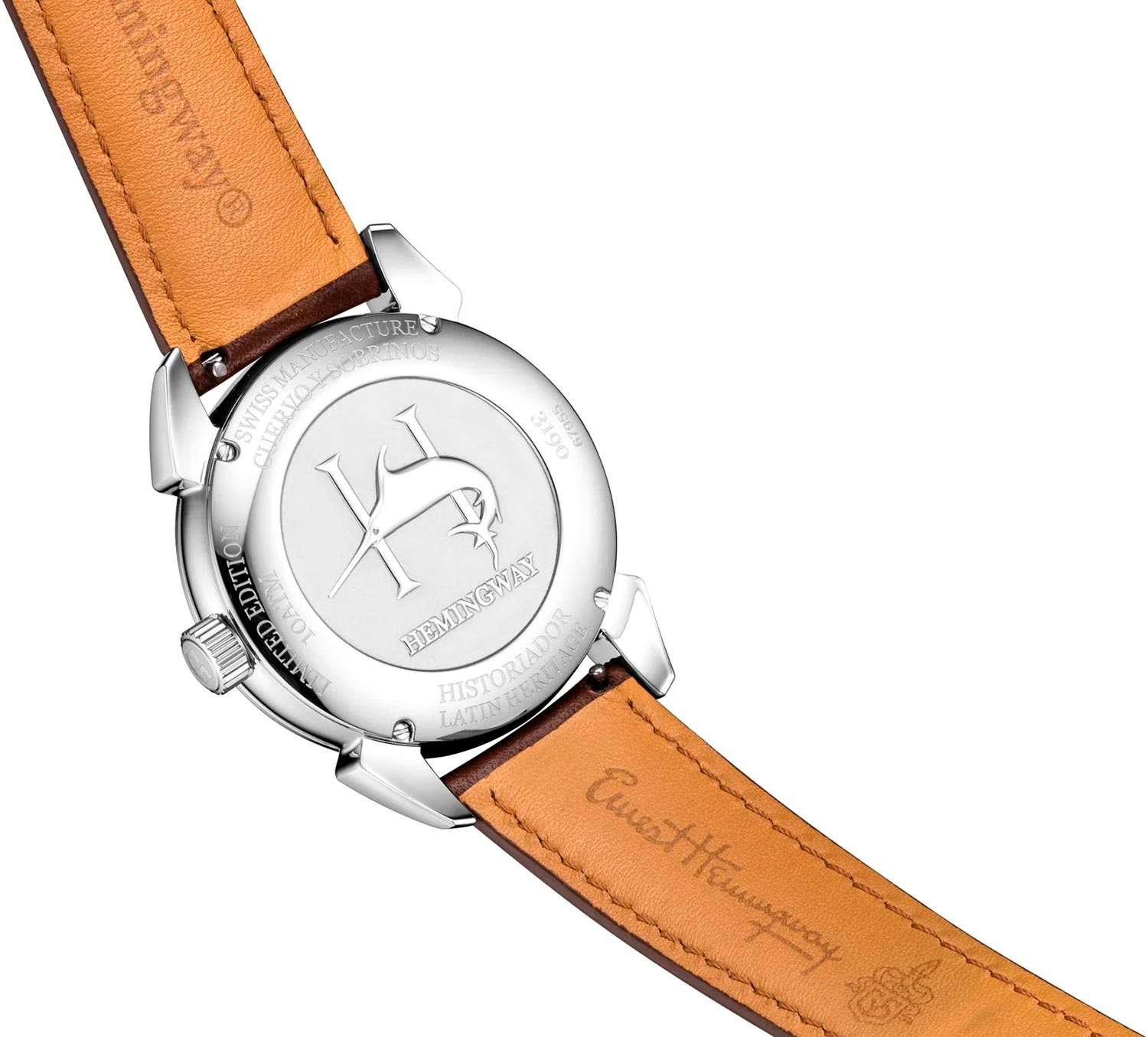 С этими стильными ретро-часами вам будут открываться новые горизонты, над которыми время не властно. Мужские автоматические часы Hemingway Iconico. Модель посвящена памяти американского писателя Эрнеста Хемингуэя. Под патронажем Джона Хемингуэя, внука писателя, часы были представлены в Ки-Уэсте, штат Флорида, ко Дням памяти Хемингуэя 2023 года. Лимитированная серия - 882 экземпляра. В механизме 26 камней, частота 28800 полуколебаний в час. Запас хода 38 часов. Круглый эргономичный корпус из полированной стали. Метки в виде арабских цифр. Метки и стрелки с люминесцентным покрытием SuperLuminova, которое светится в темноте после непродолжительной зарядки на свету. Дата отображается центральной стрелкой, которая заканчивается формой рыбьего хвоста Marlin. Внутренний безель часов украшен гравировкой цитат писателя «Чтобы писать о жизни, сначала нужно ее прожить» на английском (в положении 12 часов) и испанском (в положении 6 часов). Стальная задняя крышка украшена выгравированным логотипом Хемингуэя в честь легендарного американского писателя. Кожаный ремешок с раскладывающейся застежкой, украшенной эмблемой бренда «CyS». Система быстрой замены ремешка. В подарок элегантная кожаная шкатулка напоминающая по форме книгу, которую можно использовать как футляр для часов, или можно ставить в книжный шкаф, как книгу.