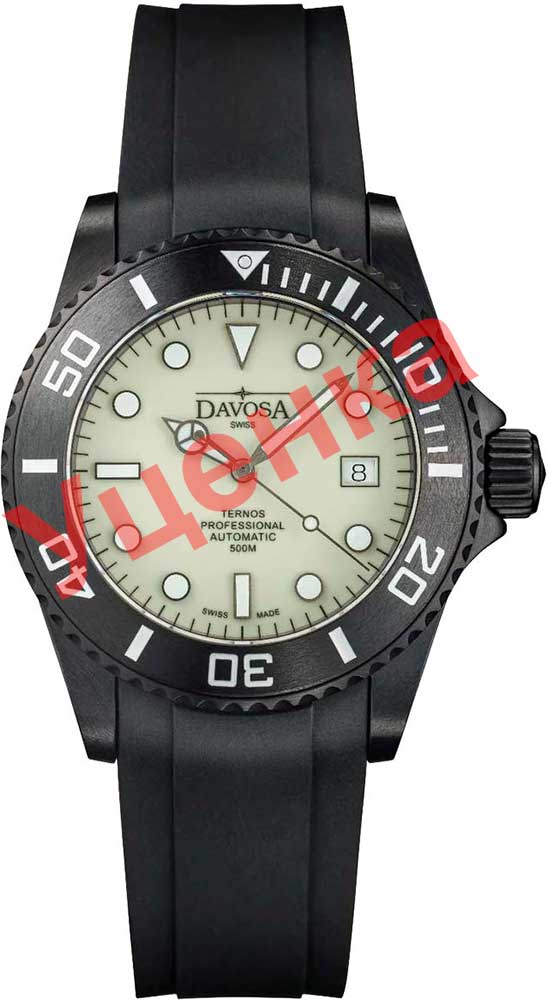 Мужские механические часы с автоподзаводом Ternos Professional Megalume LE. Лимитированная серия - 500 экземпляров. Круглый стальной корпус с черным DLC покрытием. Керамический безель вращается в одном направлении. Циферблат защищен устойчивым к царапинам сапфировым стеклом с антибликовым покрытием. По всей поверхности циферблата нанесена светящаяся краска SuperLumiNova C3. В дневное время теплый бежевый тон циферблата напоминает мелкозернистый песок популярных мест для дайвинга, в ночное время подсвечивается ярко-зеленым цветом. Окошко даты находится в положении 3 часа. Стрелки часов и метки в виде штрихов и точек с люминесцентным покрытием SuperLumiNova BGW9, которое эффектно светится в темноте. Функция остановки секундной стрелки. Автоматический гелиевый предохранительный клапан обеспечивает в часах выравнивание давления при извлечении на поверхность. Завинчивающаяся рифленая заводная головка с защитой. Завинчивающаяся задняя крышка. Надежный и прочный каучуковый ремешок с регулируемой застежкой позволяет легко носить часы поверх гидрокостюма.