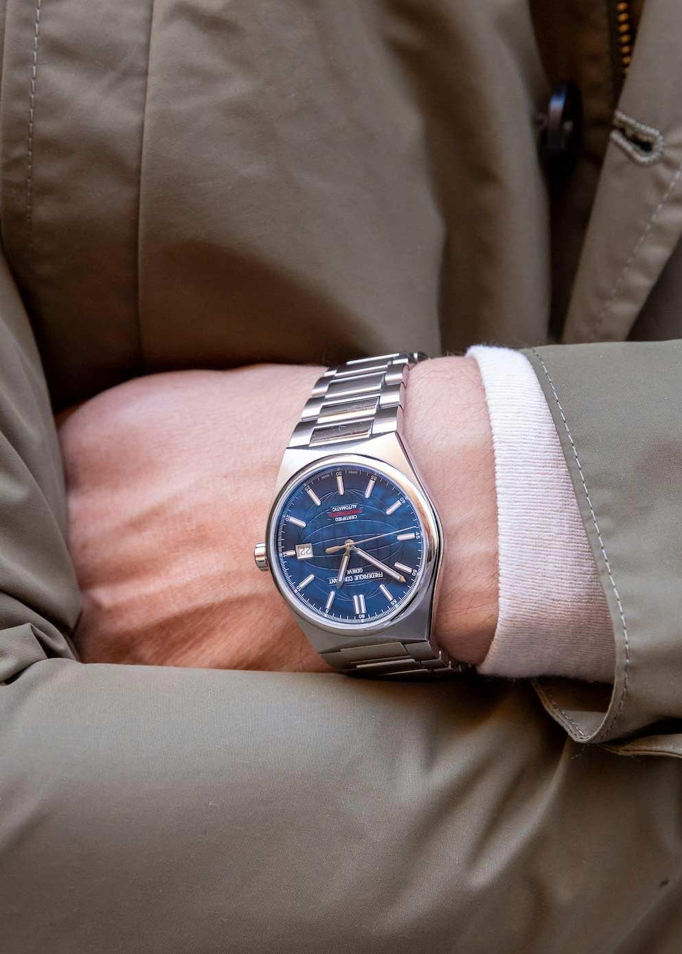 Стальной корпус без ушек, что является отличительной чертой модели. Циферблат выполнен по технологии Sunray (солнечные лучи) и украшен узором в виде глобуса. Накладные метки в виде штрихов.