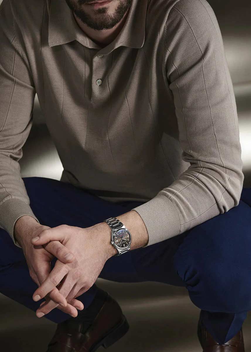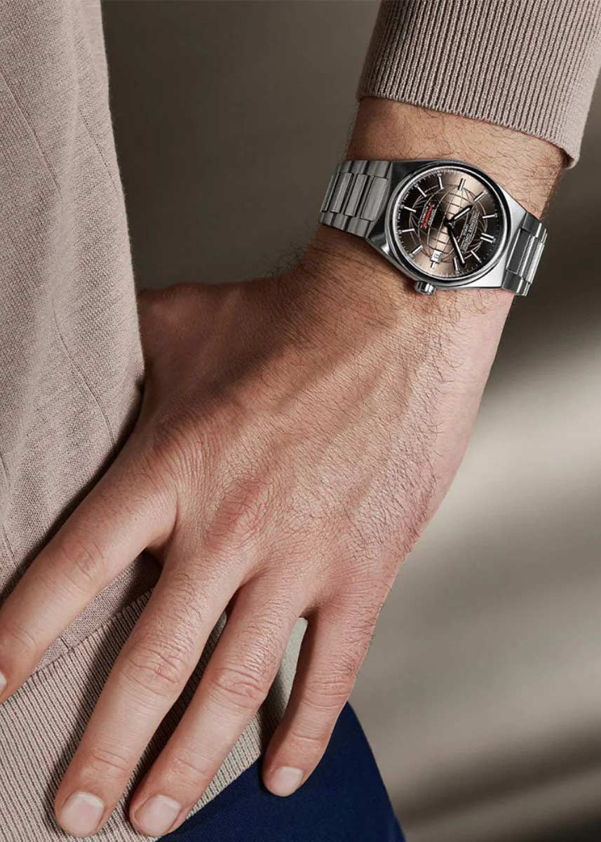 Стальной корпус без ушек, что является отличительной чертой модели. Циферблат выполнен по технологии Sunray (солнечные лучи) и украшен узором в виде глобуса. Накладные метки в виде штрихов.