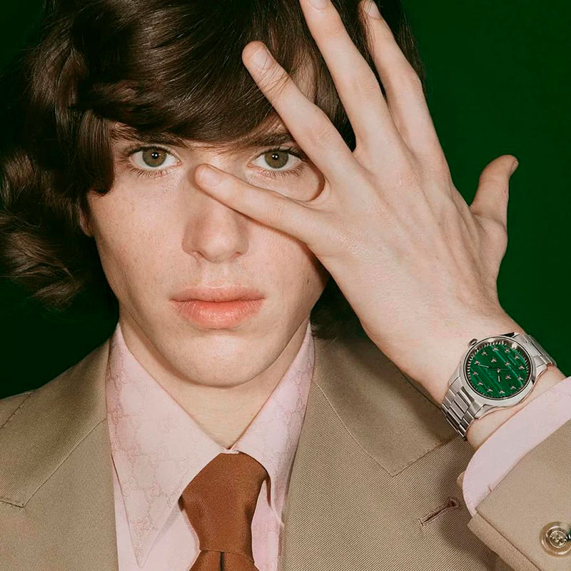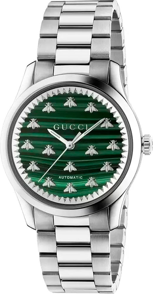 Мужские часы G-Timeless. Круглый стальной корпус. Циферблат украшен изображением пчел — фирменным символом модного дома. Завинчивающаяся рифленая заводная головка. Прозрачная задняя крышка. Браслет с тройной раскладывающейся застежкой.
