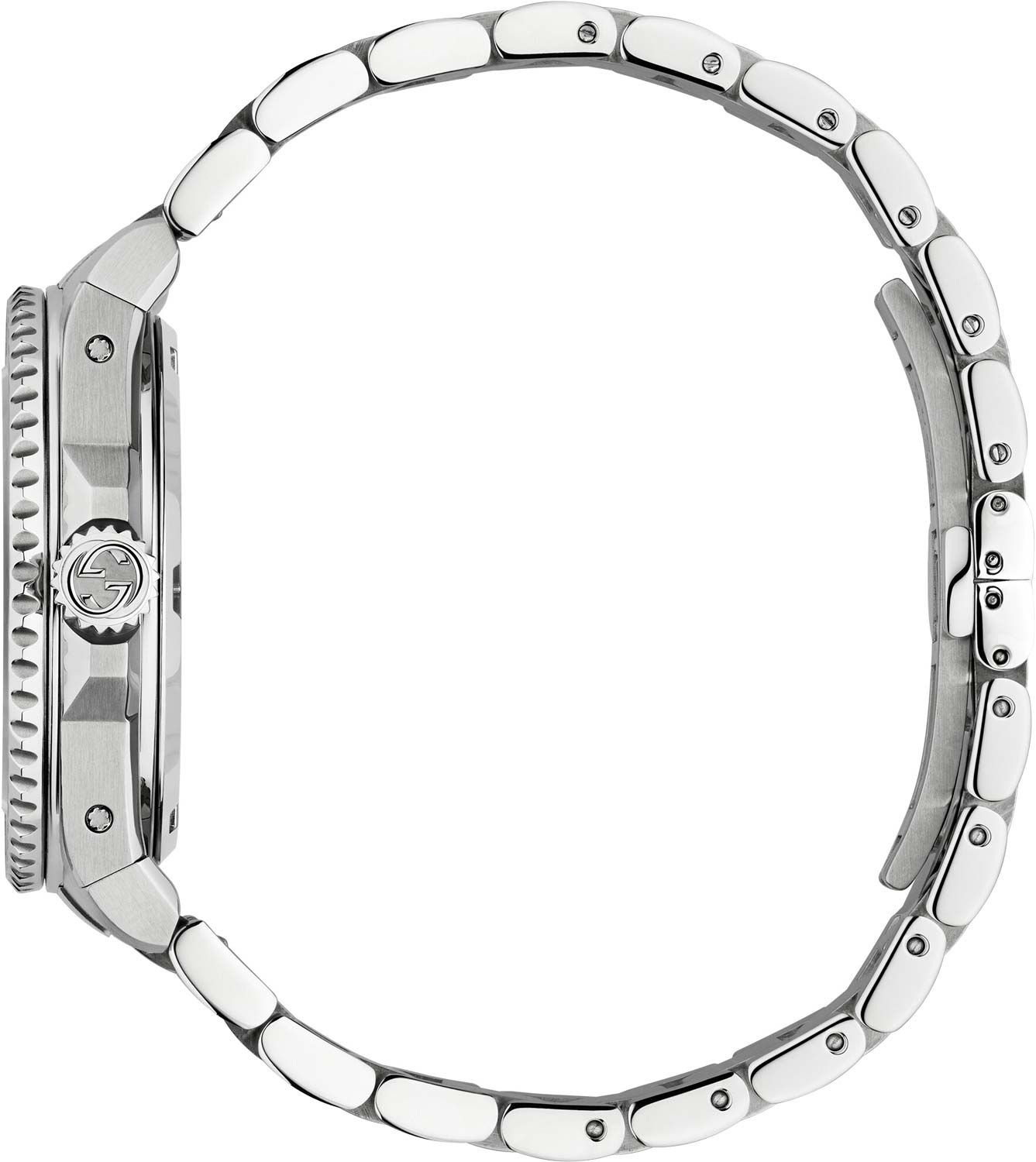 Механические наручные часы Gucci Dive. Запас хода до 38 часов. Круглый стальной корпус. Керамический безель с минутной шкалой. Циферблат с накладными метками в виде штрихов выполнен по технологии Sunray (солнечные лучи). Метки и стрелки с люминесцентным покрытием SuperLuminova, которое светится в темноте после непродолжительной зарядки на свету. Рифленая заводная головка с защитой. Надежный стальной браслет с раскладывающейся застежкой.