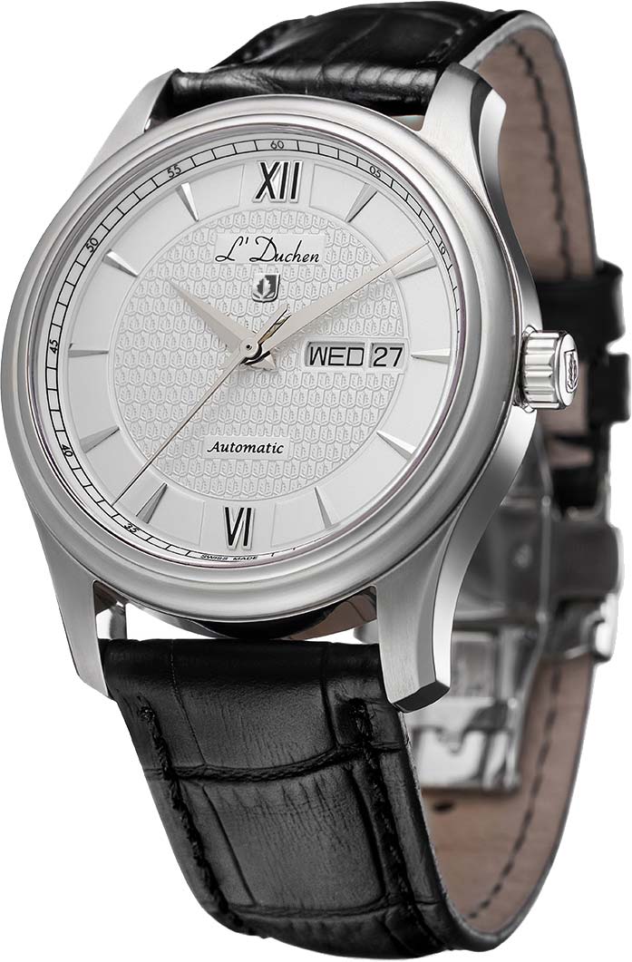 Прозрачная задняя крышка с сапфировым стеклом закреплена на четырех винтах. Сквозь прозрачное окошко можно наблюдать за работой швейцарского механизма Sellita с функцией автоподзавода. Рифленая заводная головка. Удобный ремешок выполнен из натуральной кожи с прошивкой. Раскладывающаяся застежка с фирменным логотипом L'Duchen в виде дубового листа.