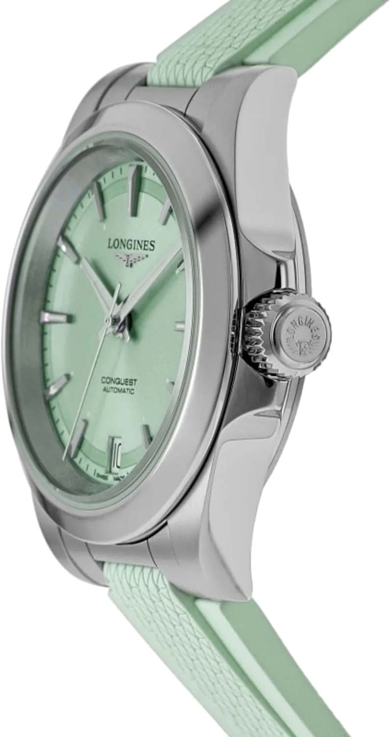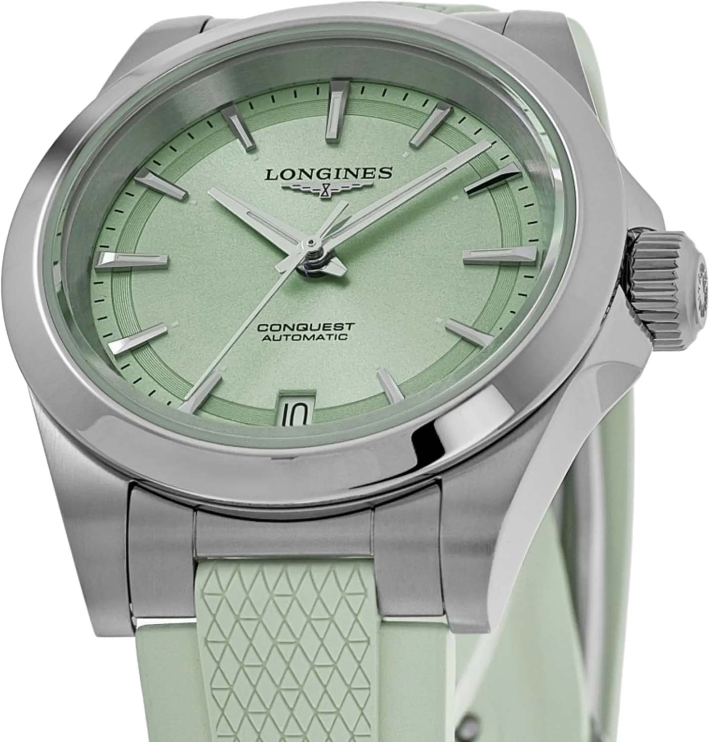 Женские наручные часы. Эксклюзивный механизм Longines с частотой 25200 полуколебаний в час и монокристаллической кремниевой спиралью баланса. Запас хода примерно 72 часа. Круглый стальной корпус. Циферблат выполнен по технологии Sunray (солнечные лучи) и защищен прочным сапфировым стеклом. Накладные метки в виде штрихов. Окошко даты находится в положении 6 часов.