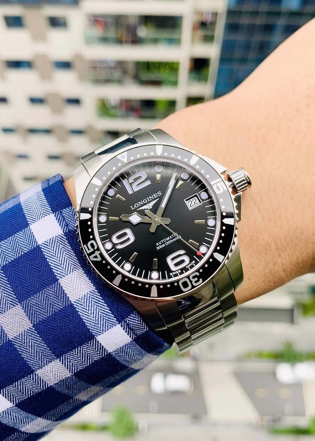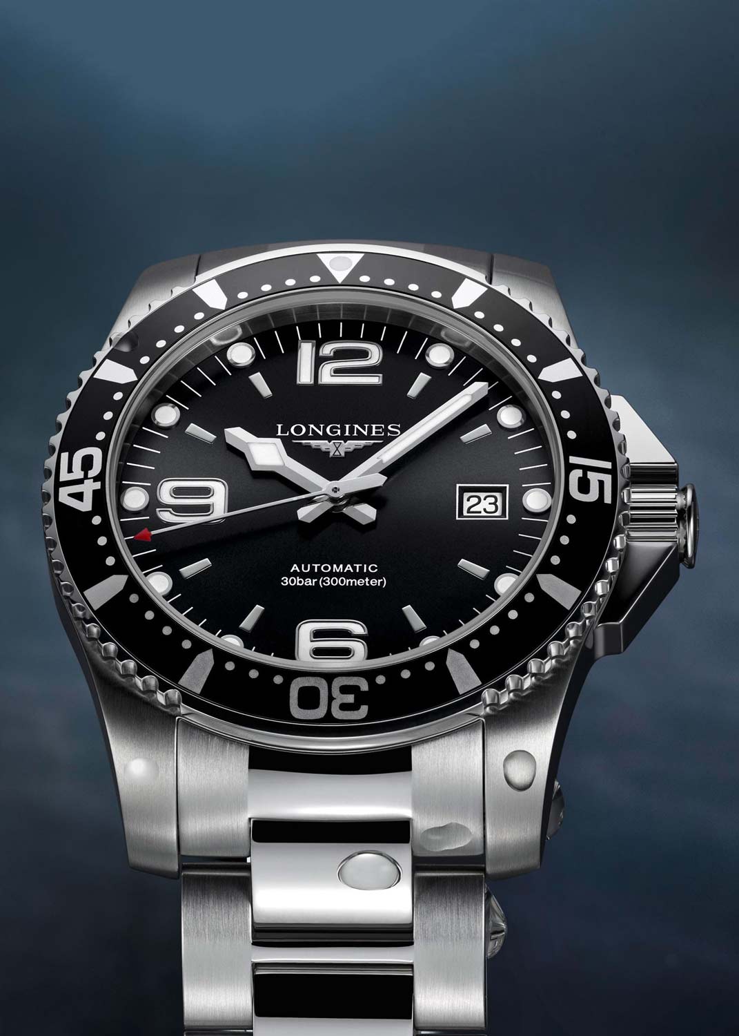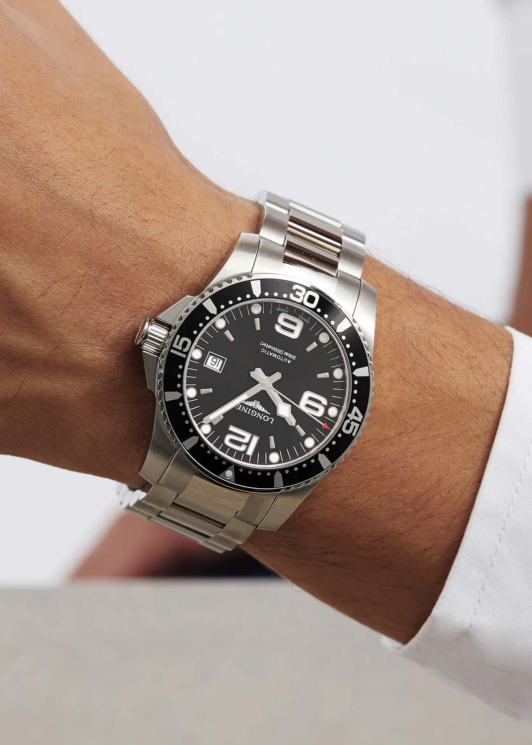 Мужские наручные часы. Эксклюзивный механизм Longines с частотой 25200 полуколебаний в час. Запас хода примерно 72 часа. Круглый стальной корпус. Безель вращается в одном направлении. Циферблат выполнен по технологии Sunray (солнечные лучи) и защищен прочным сапфировым стеклом. Накладные метки в виде штрихов, точек и арабских цифр.