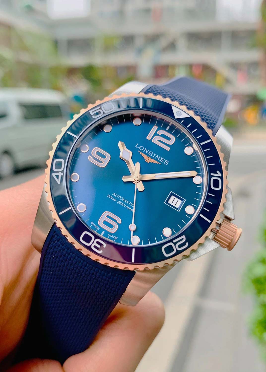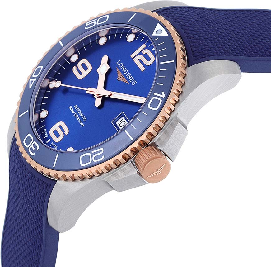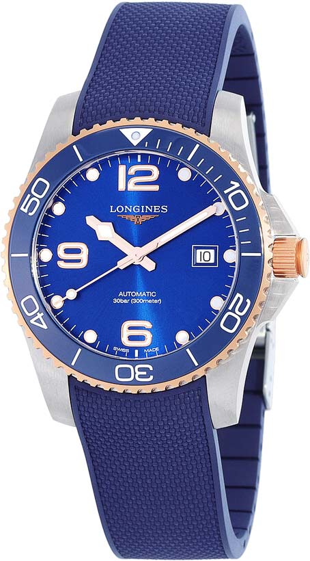Мужские наручные часы. Эксклюзивный механизм Longines с частотой 25200 полуколебаний в час. Запас хода примерно 72 часа. Круглый стальной корпус. Безель с керамической вставкой вращается в одном направлении. Циферблат выполнен по технологии Sunray (солнечные лучи) и защищен прочным сапфировым стеклом. Накладные метки в виде точек и арабских цифр.