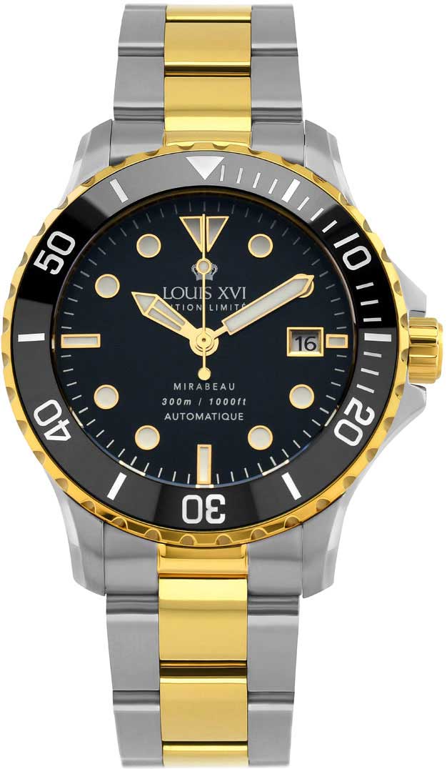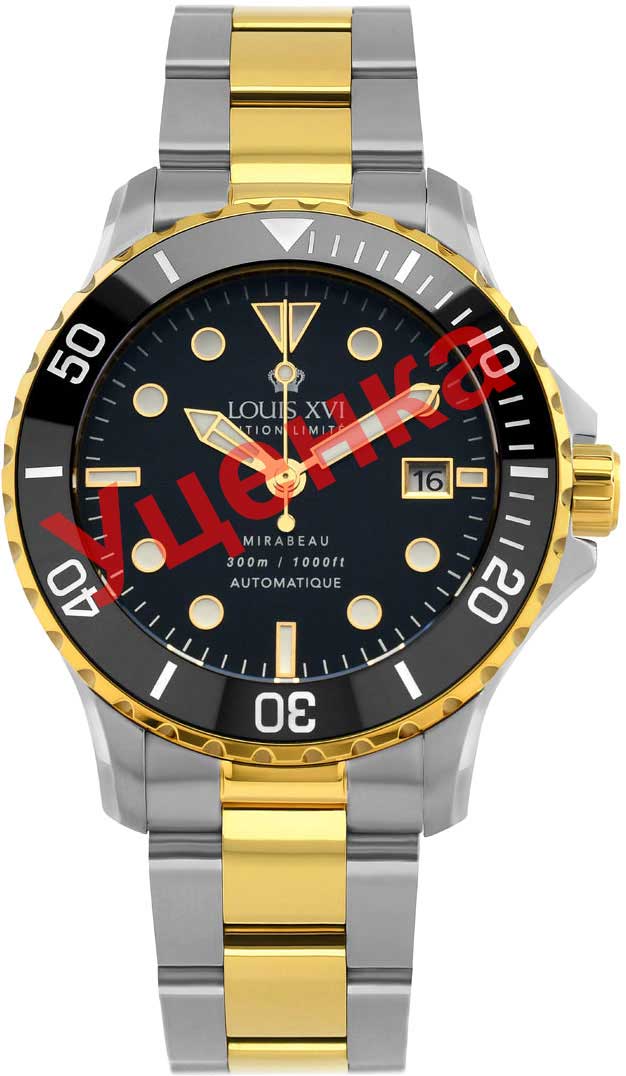 Уценка. Царапины на корпусе и браслете. Mirabeau. Лимитированная серия - 1000 экземпляров. Сталь 316L, из которой изготовлены часы, используется для производства хирургических инструментов, так как она отличается наибольшей прочностью и устойчивостью к коррозии. Керамический вращающийся безель с минутной шкалой. Производство керамических безелей очень сложное, поэтому керамические вставки используются только в высококачественных часах. Большим преимуществом керамики является то, что она гораздо меньше царапается, чем другие материалы - некрасивые царапины на безеле уходят в прошлое. Метки в виде штрихов и точек. Мечевидные стрелки, метки циферблата и безеля с люминесцентным покрытием Super-Luminova, которое светится в темноте после непродолжительной зарядки на свету. Окошко даты находится в положении 3 часа. Рифленая заводная головка с защитой украшена логотипом компании Louis XVI. Механизм R150 с автоматическим заводом, шарикоподшипниками с обеих сторон и швейцарским рычажным спуском является идеальным главным элементом этих часов. В механизме 25 камней.