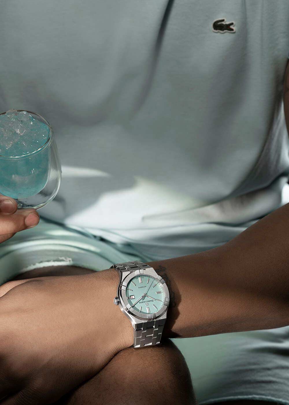 Лимитированная серия Aikon Automatic Limited Summer Edition — 888 экземпляров. Наручные часы с автоматическим механизмом. В механизме 26 камней, частота 28800 полуколебаний в час. Запас хода 38 часов. Круглый стальной корпус с полированными и сатинированными поверхностями. Безель с привлекательным дизайном из шести «когтей». Гильошированный циферблат с узором Clous de Paris защищен прочным сапфировым стеклом. Накладные метки в виде штрихов. Заостренные прямоугольные стрелки в стиле Baton.