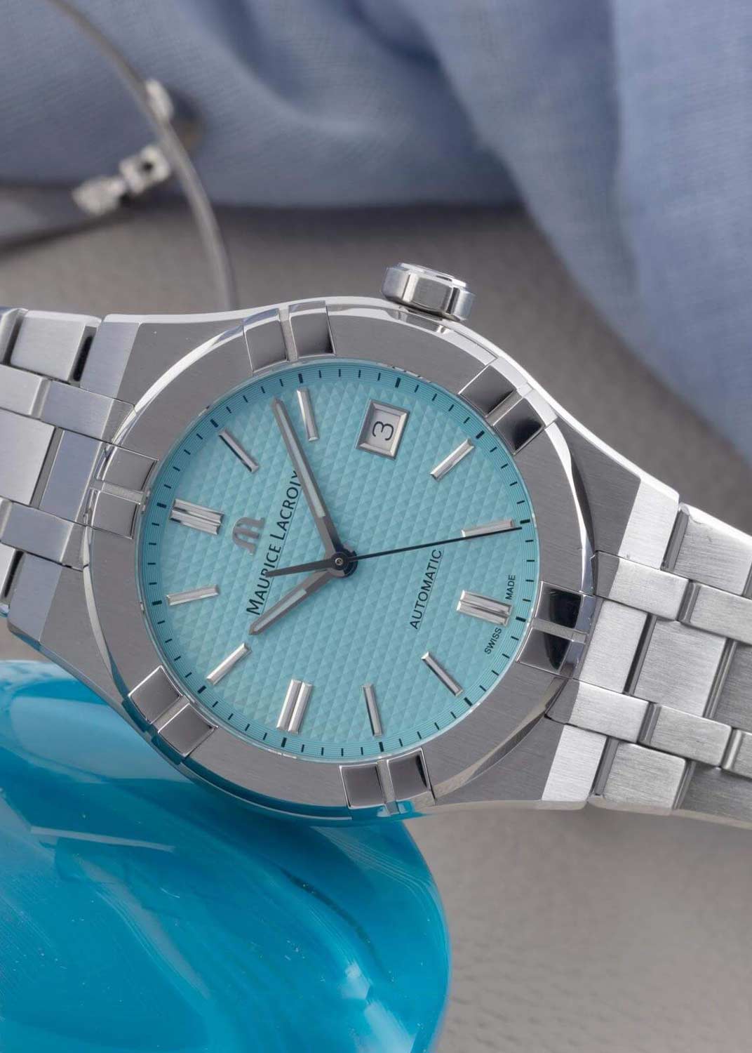 Стрелки и метки с люминесцентным покрытием, которое светится в темноте после непродолжительной зарядки на свету. Окошко даты находится в положении 3 часа. Граненая заводная головка. Прозрачная задняя крышка крепится на винтах. Надежный стальной браслет с раскладывающейся застежкой. Система быстрой замены браслета. В комплекте сменный каучуковый ремешок с классической стальной застежкой. Бренд Maurice Lacroix заботится об окружающей среде и изготавливает фирменную упаковку из океанического переработанного пластика.