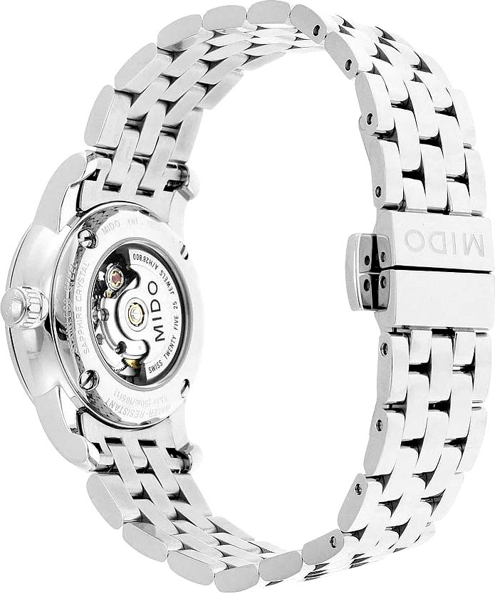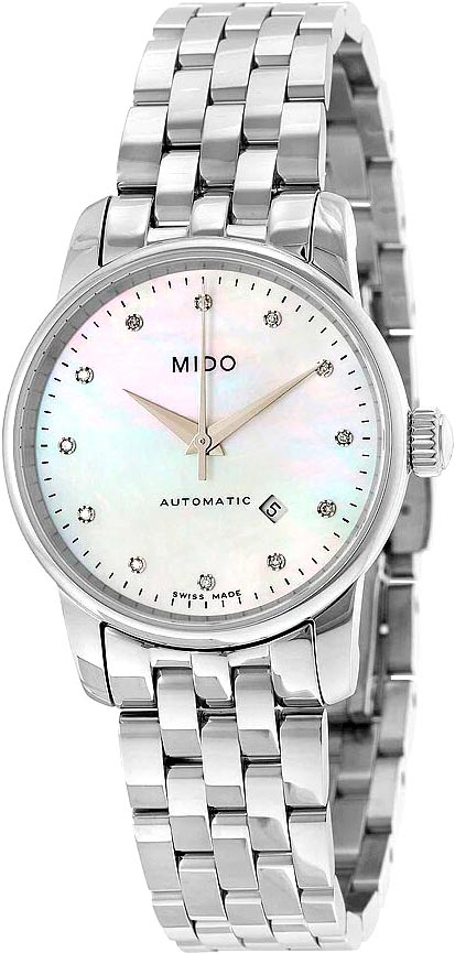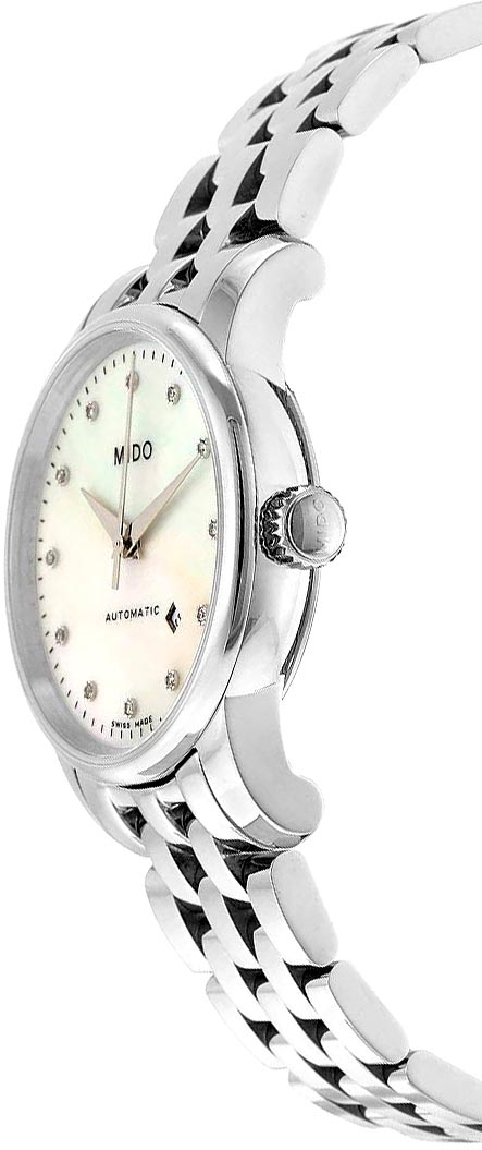 Женские наручные автоматические часы Baroncelli Diamonds. Круглый стальной корпус. В механизме 25 камней, частота 21600 полуколебаний в час. Запас хода 38 часов. Противоударное устройство оси баланса Incabloc. Перламутровый циферблат. Накладные метки в виде точек, украшенных бриллиантами. Клиновидные стрелки в стиле Dauphine. Окошко даты находится между часовыми отметками 4 и 5. Рифленая заводная головка. Прозрачная задняя крышка на 4-х болтах. Стальной браслет с раскладывающейся застежкой.