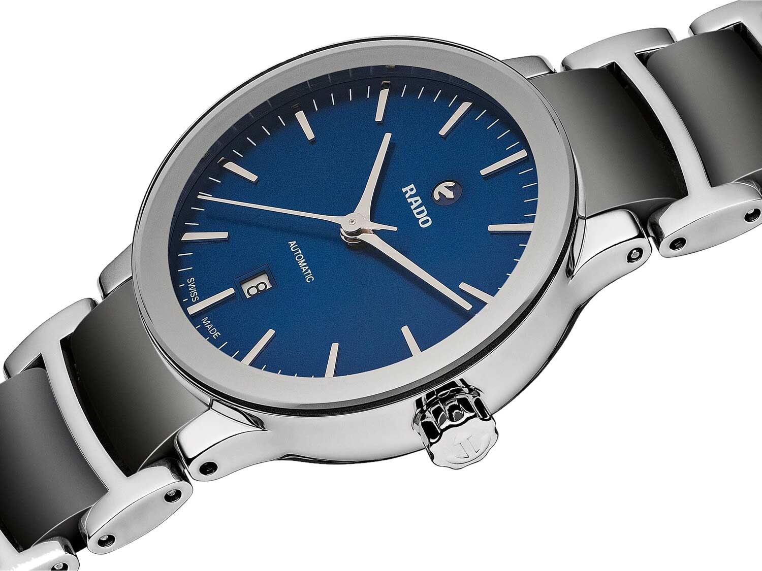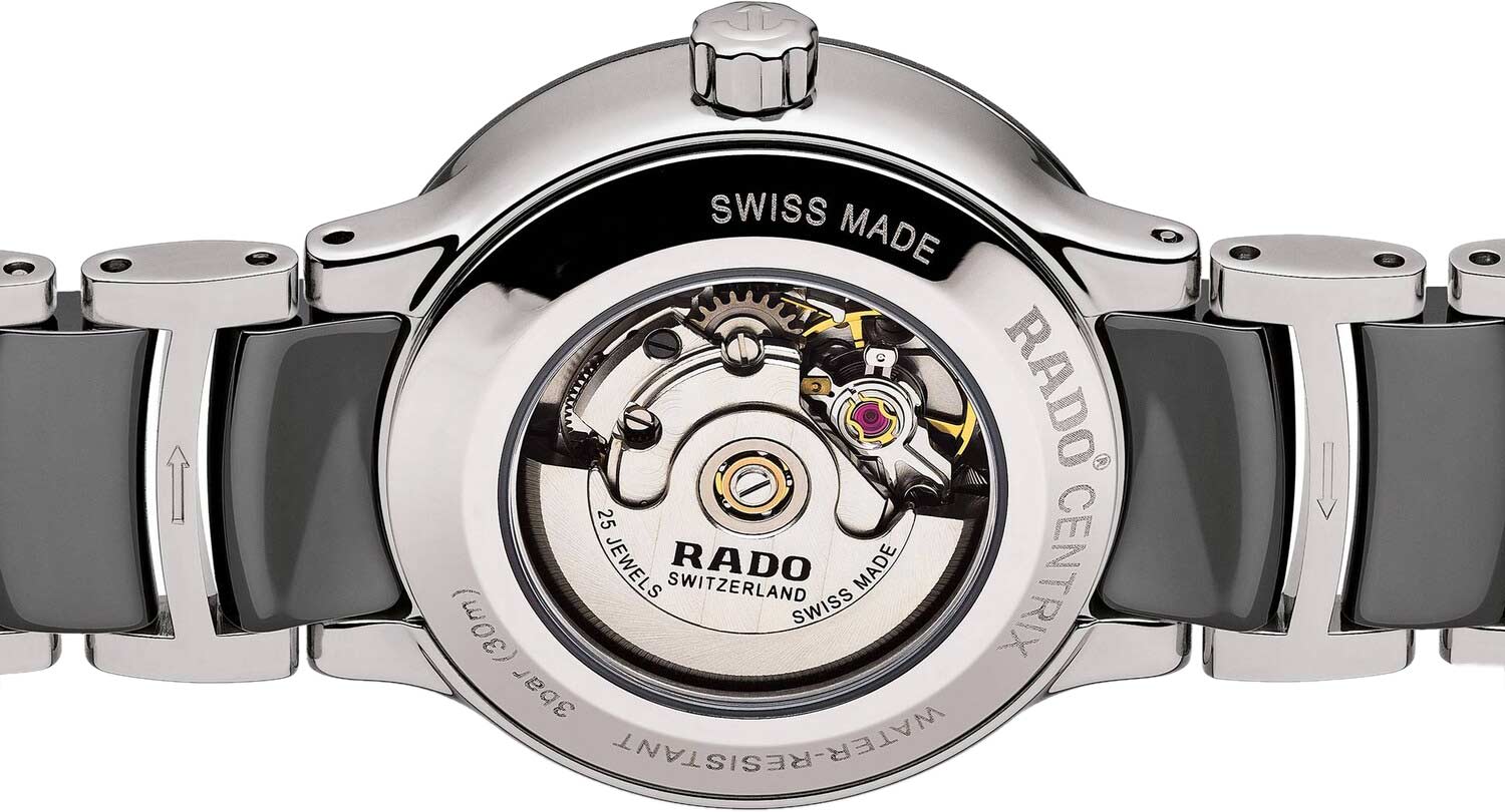 Рифленая заводная головка. Прозрачная задняя крышка. Надежный стальной браслет со вставками из черной керамики. Раскладывающаяся застежка. Имеется мужской вариант модели R30010202.