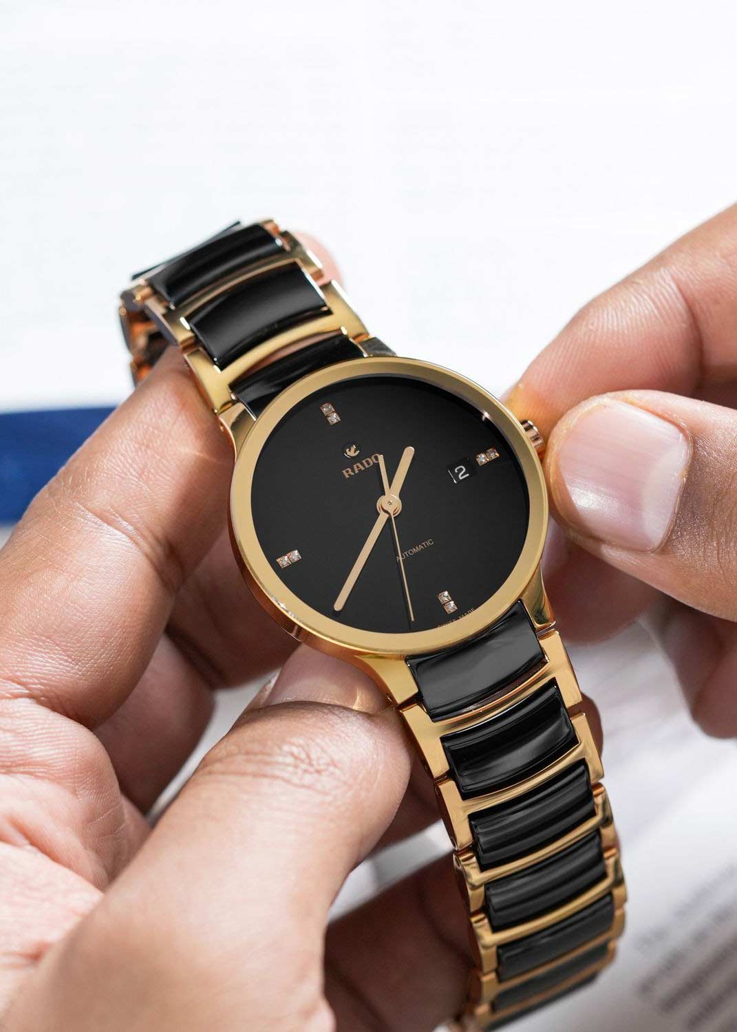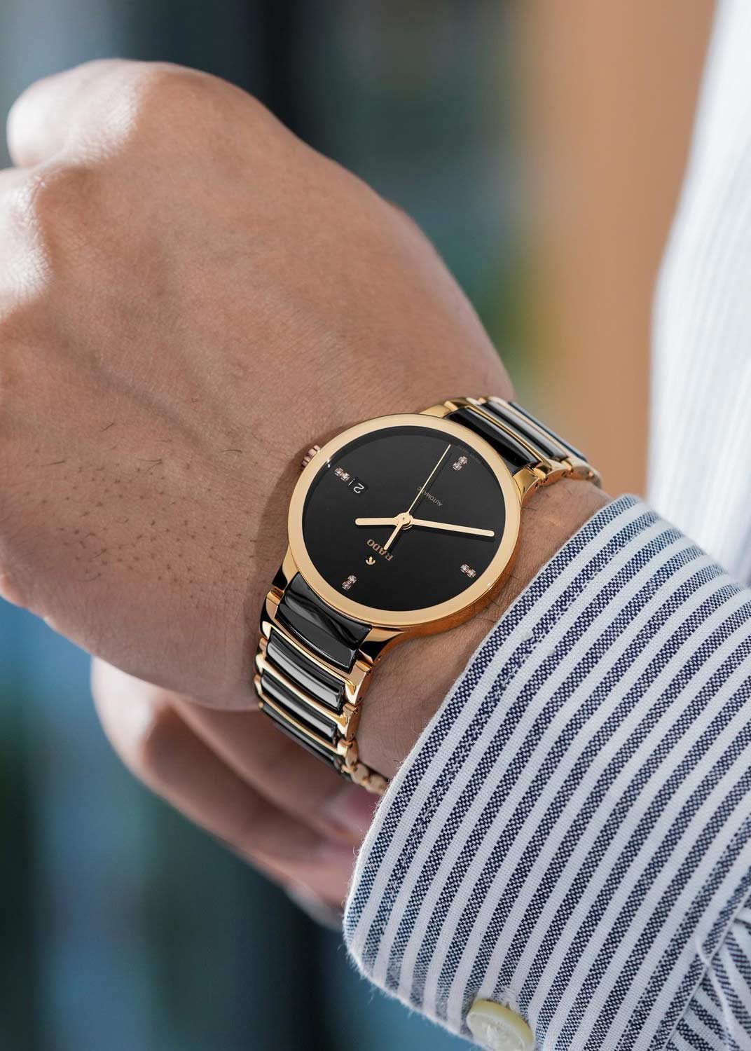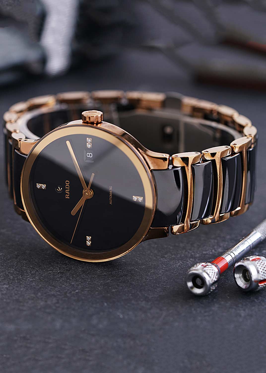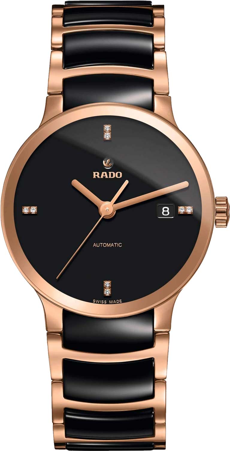Рифленая заводная головка. Прозрачная задняя крышка. Надежный стальной браслет со вставками из керамики. Раскладывающаяся застежка.
