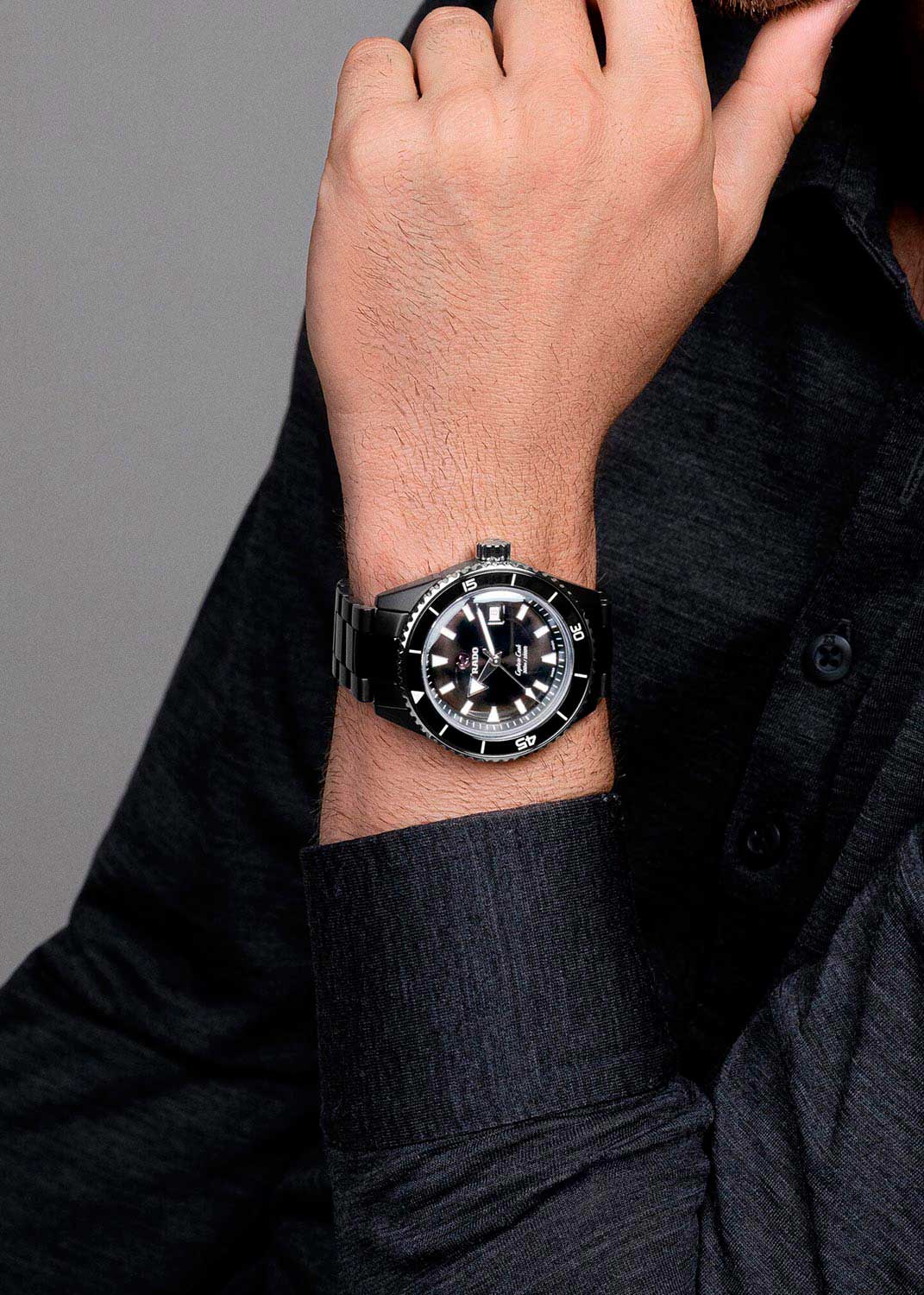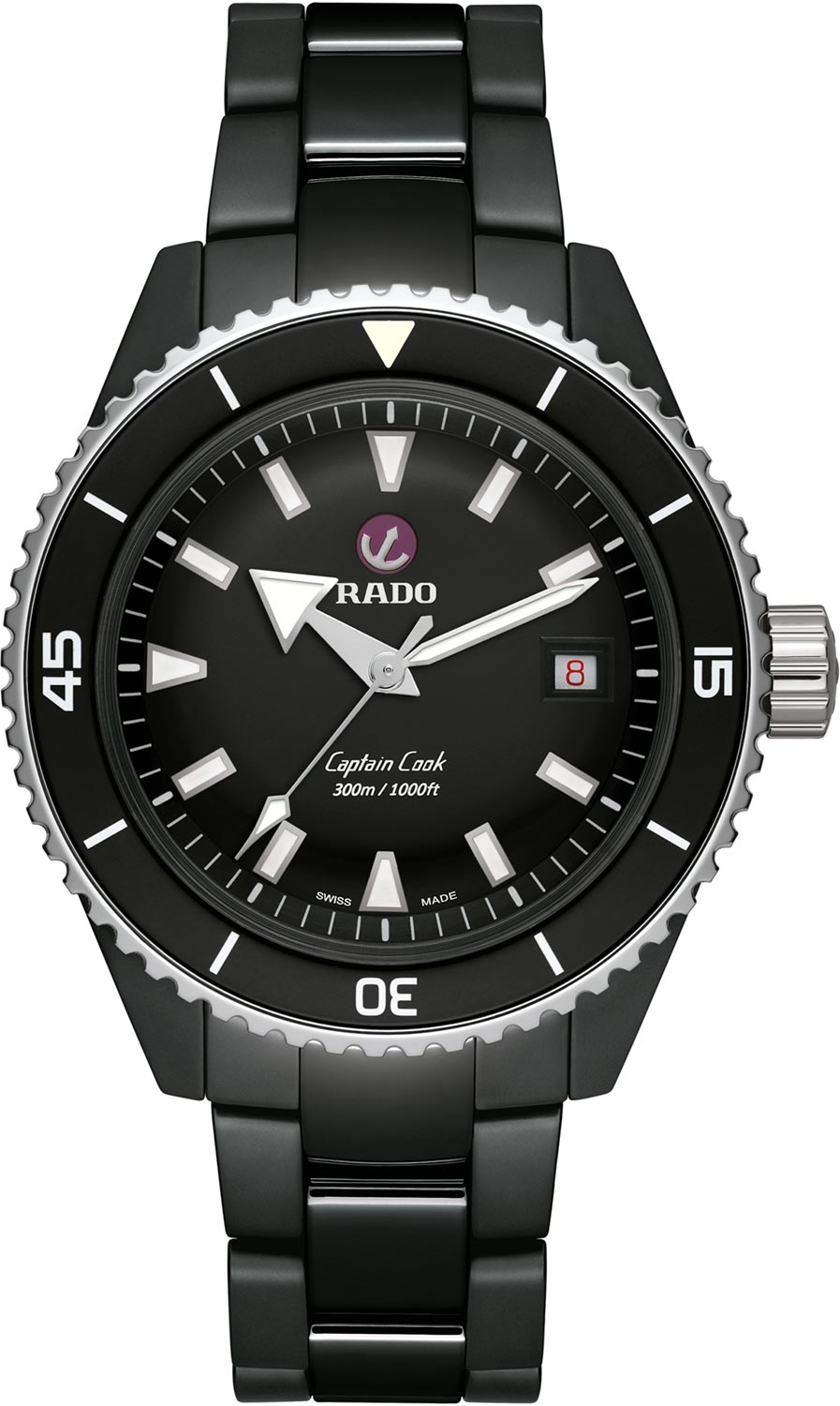Метки и стрелки с люминесцентным покрытием, которое светится в темноте после непродолжительной зарядки на свету. Окошко даты находится в положении 3 часа. Рифленая заводная головка. Задняя крышка украшена гравировкой. Надежный керамический браслет с раскладывающейся застежкой.