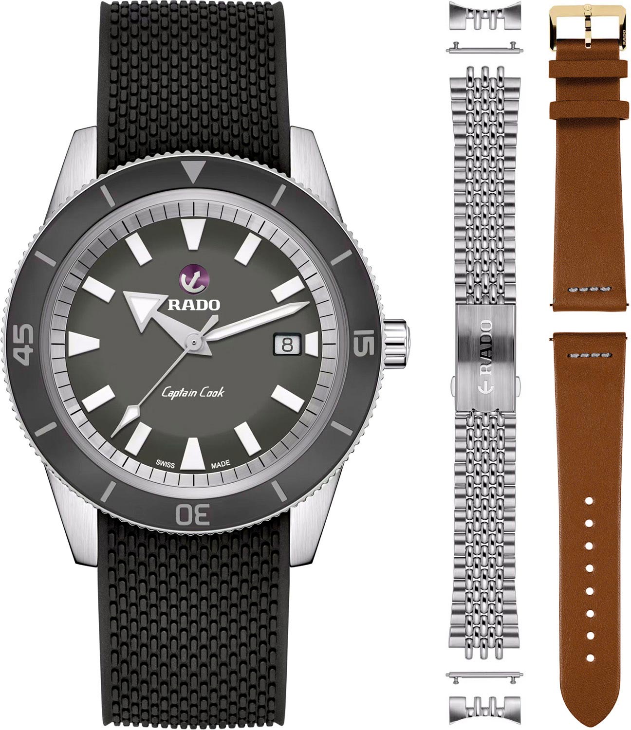 Дизайн этих часов идеально сочетает в себе спортивный дух и динамичность. Набор с швейцарскими мужскими наручными часами Captain Cook Automatic. В механизме 25 камней. Запас хода 80 часов. Круглый стальной корпус. Рифленый керамический безель с минутной шкалой. Матовый циферблат с метками в виде штрихов. Метки и стрелки с люминесцентным покрытием, которое светится в темноте после непродолжительной зарядки на свету. Окошко даты находится в положении 3 часа. Рифленая завинчивающаяся заводная головка. Завинчивающаяся задняя крышка украшена гравировкой. Система быстрой замены ремешка. Черный каучуковый ремешок с классической застежкой. В комплекте сменный стальной браслет с раскладывающейся застежкой и кожаный ремешок с классической застежкой.