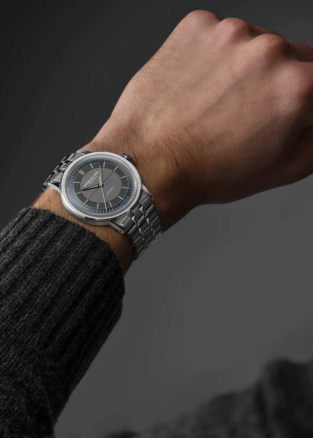 Мужские автоматические часы. Высокоточный швейцарский механизм с запасом хода 41 час. Круглый стальной корпус. Циферблат с метками в виде штрихов защищен прочным сапфировым стеклом. Клиновидные стрелки в стиле Dauphine с люминесцентным покрытием, которое светится в темноте после непродолжительной зарядки на свету.