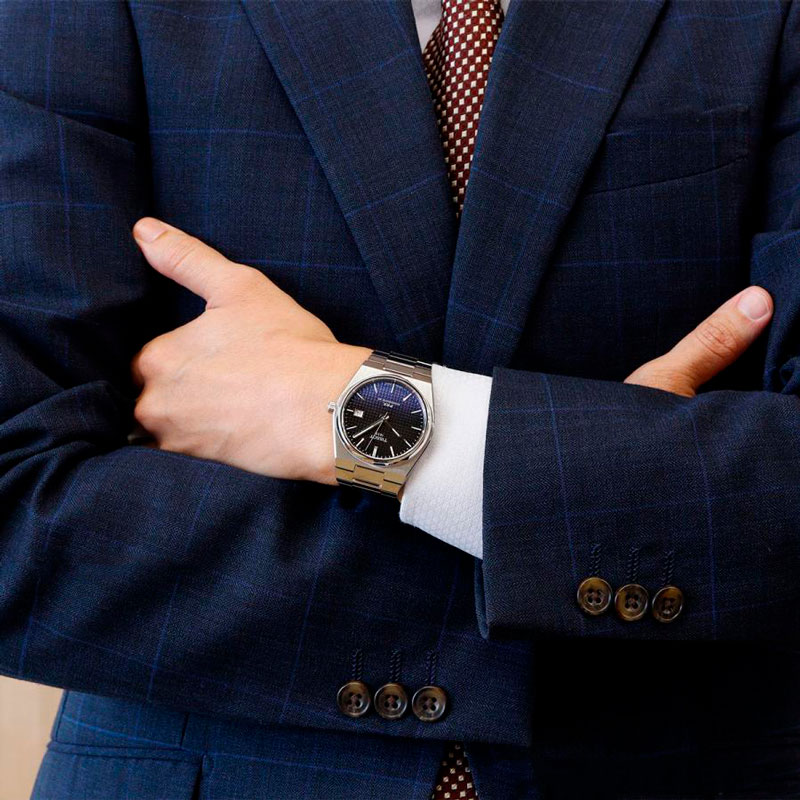 Автоматические наручные часы PRX Powermatic 80. В механизме 23 камня, частота 21600 полуколебаний в час. Запас хода 80 часов. Запатентованная пружина баланса Nivachron. Стальной корпус c сатинированной поверхностью. Градиентный циферблат украшен узором Clous de Paris. Прямоугольные стрелки в стиле Baton. Метки в виде штрихов. Метки и стрелки с люминесцентным покрытием, которое светится в темноте после непродолжительной зарядки на свету. Окошко даты находится в положении 3 часа. Рифленая заводная головка. Прозрачная задняя крышка. Надежный стальной браслет с застежкой-бабочкой и системой быстрой замены.