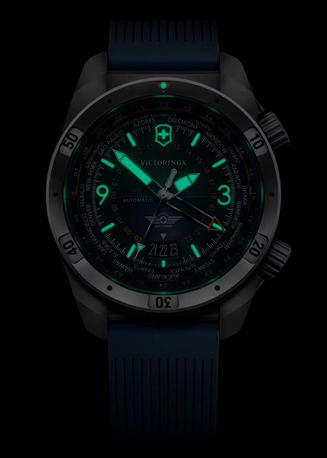 Окошко даты находится в положении 6 часов. Люминесцентные стрелки и метки SuperLuminova, которые светятся в темноте после непродолжительной зарядки на свету. Две рифленые закручивающиеся заводные головки. Головка в положении 4 часа управляет временем и секундами, головка в положении 2 часа управляет функциями GMT. Прозрачная завинчивающаяся задняя крышка. Резиновый ремешок с раскладывающейся застежкой и системой быстрой замены.