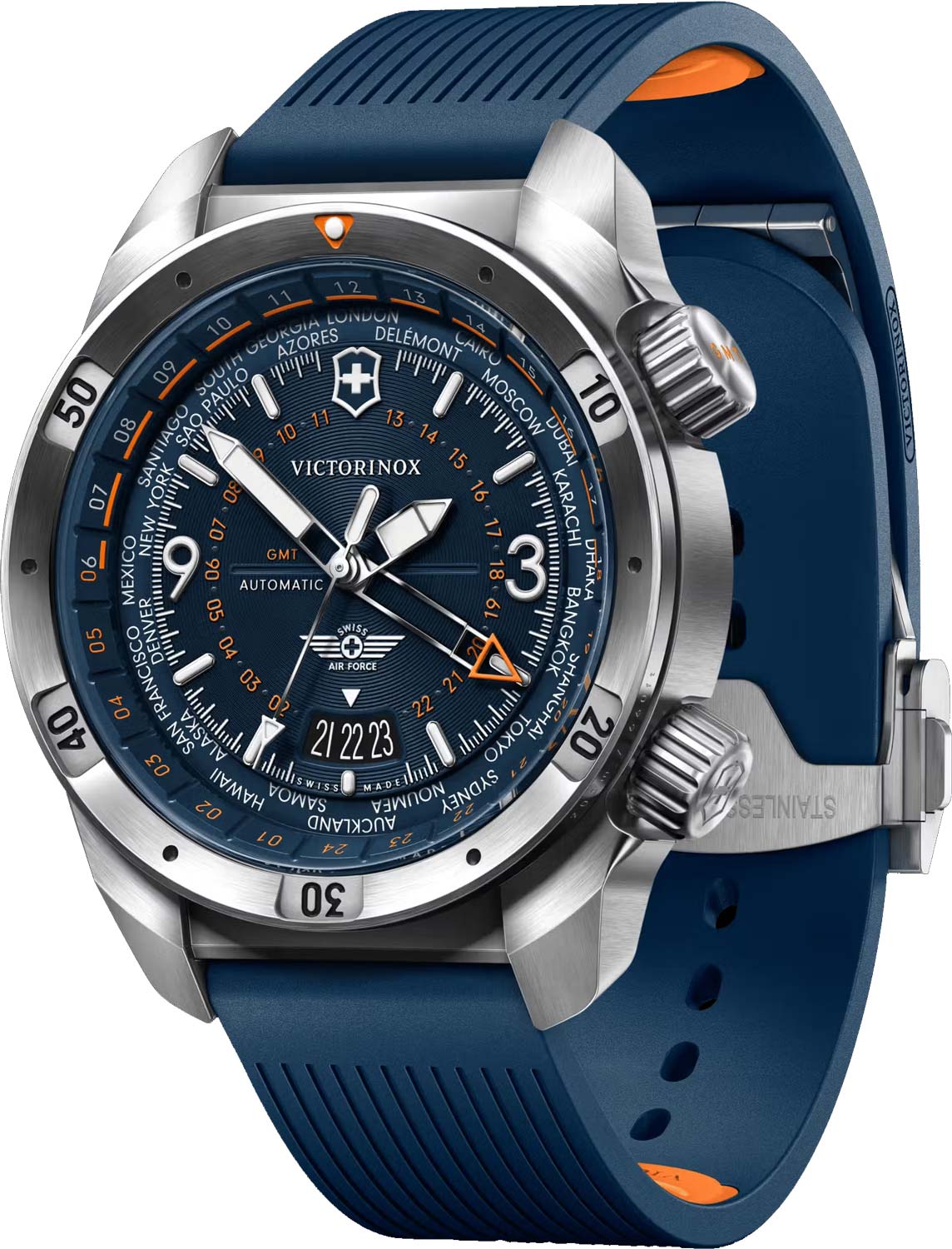 Air Pro. Механические наручные часы. В механизме 25 камней с частотой 28800 полуколебаний в час. Запас хода 56 часов. Круглый стальной корпус с матовой отделкой. Полированный безель с минутной шкалой. Трехмерный циферблат с метками в виде штрихов и арабских цифр позволяет отслеживать время в трех часовых поясах. Для отслеживания второго часового пояса есть четвертая стрелка на циферблате.