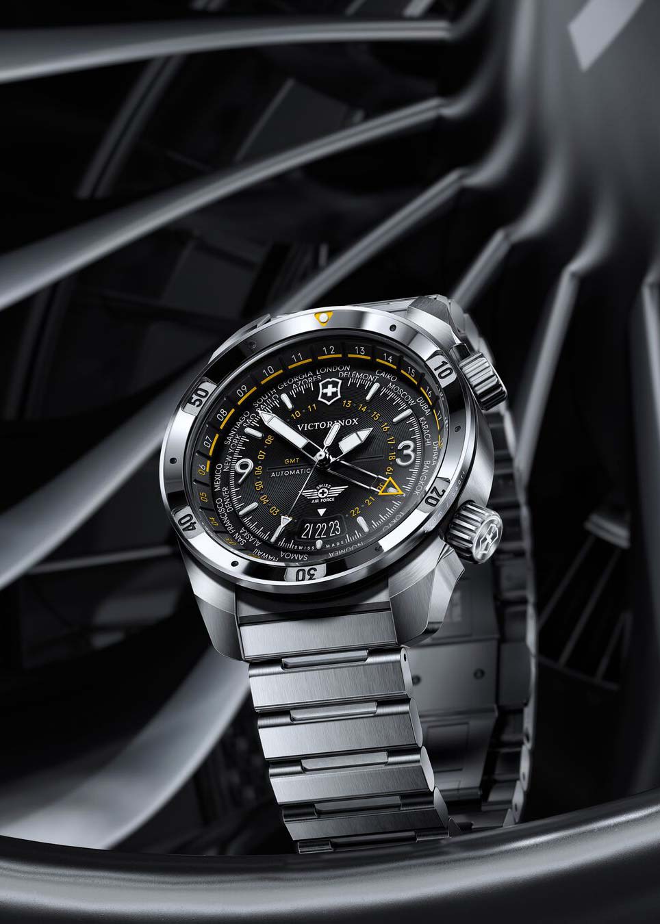 Air Pro. Механические наручные часы. В механизме 25 камней с частотой 28800 полуколебаний в час. Запас хода 56 часов. Круглый стальной корпус с матовой отделкой. Полированный безель с минутной шкалой. Трехмерный циферблат с метками в виде штрихов и арабских цифр позволяет отслеживать время в трех часовых поясах. Для отслеживания второго часового пояса есть четвертая стрелка на циферблате.