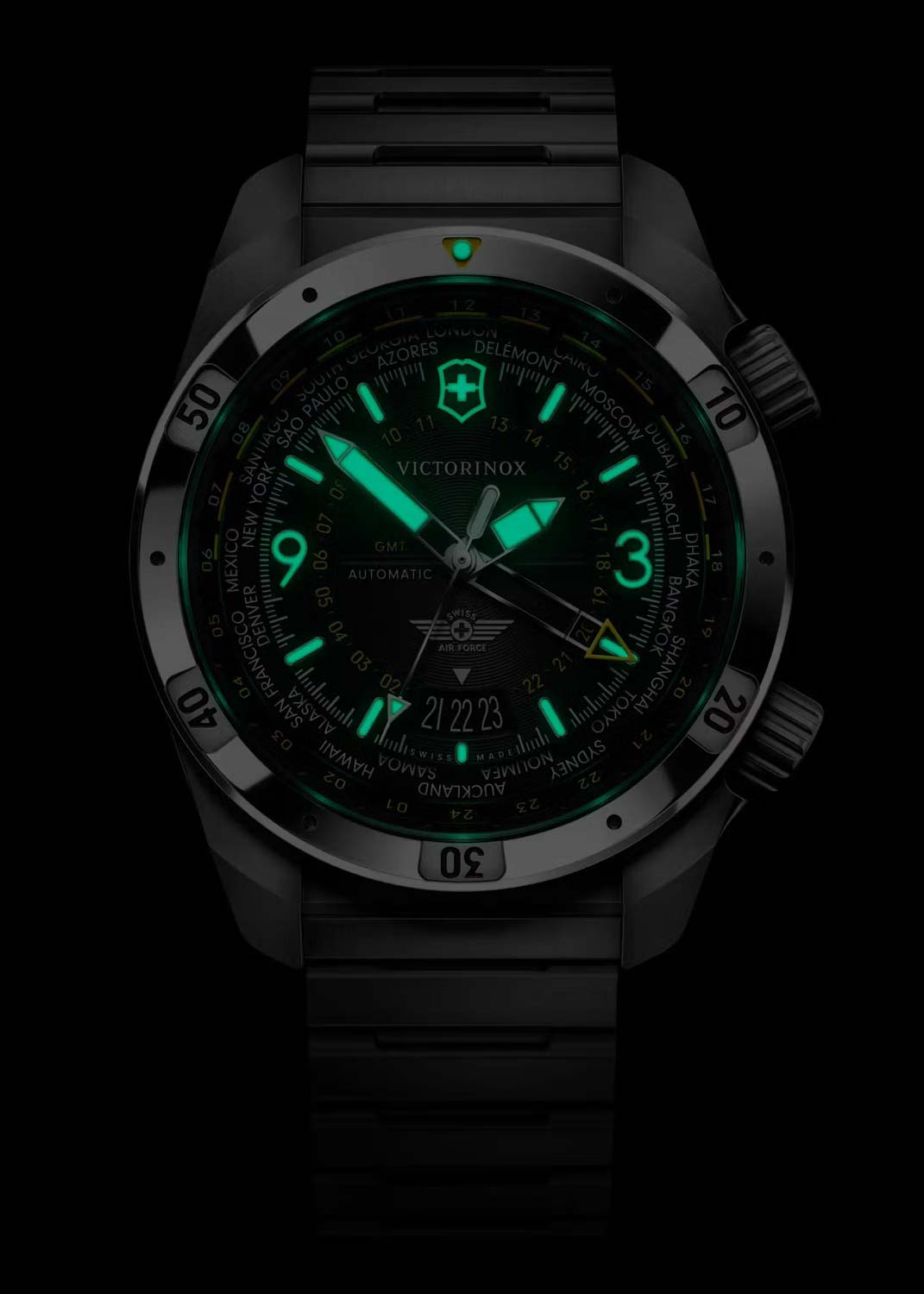 Окошко даты находится в положении 6 часов. Люминесцентные стрелки и метки SuperLuminova, которые светятся в темноте после непродолжительной зарядки на свету. Две рифленые закручивающиеся заводные головки. Головка в положении 4 часа управляет временем и секундами, головка в положении 2 часа управляет функциями GMT. Прозрачная завинчивающаяся задняя крышка. Надежный стальной браслет с раскладывающейся застежкой.