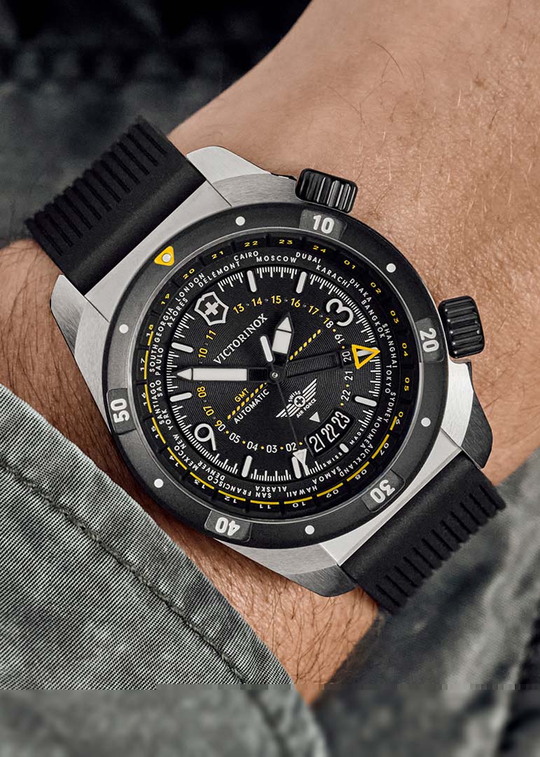Air Pro. Механические наручные часы. В механизме 25 камней с частотой 28800 полуколебаний в час. Запас хода 56 часов. Круглый стальной корпус с матовой отделкой. Полированный безель с минутной шкалой. Трехмерный циферблат с метками в виде штрихов и арабских цифр позволяет отслеживать время в трех часовых поясах. Для отслеживания второго часового пояса есть четвертая стрелка на циферблате.