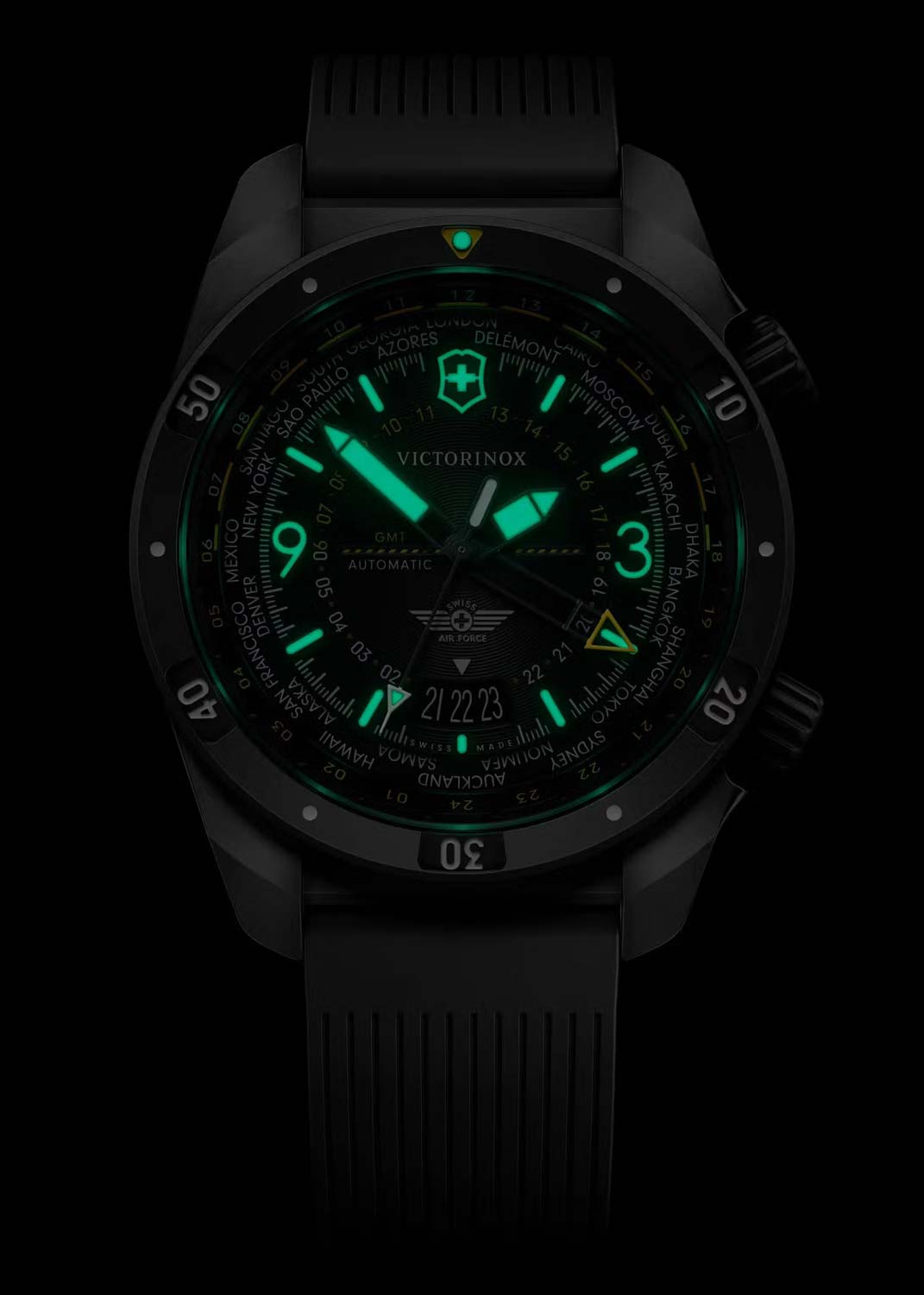 Окошко даты находится в положении 6 часов. Люминесцентные стрелки и метки SuperLuminova, которые светятся в темноте после непродолжительной зарядки на свету. Две рифленые закручивающиеся заводные головки. Головка в положении 4 часа управляет временем и секундами, головка в положении 2 часа управляет функциями GMT. Прозрачная завинчивающаяся задняя крышка. Резиновый ремешок с раскладывающейся застежкой и системой быстрой замены.