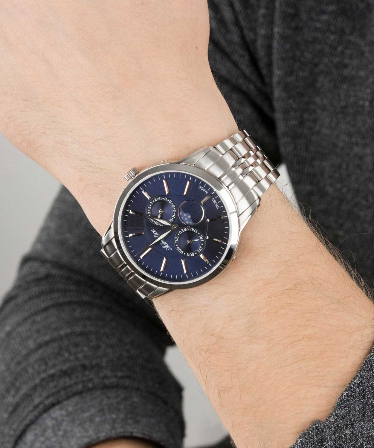 Классические черты этих часов преобразят образ настоящего мужчины. Moonphase for him. Индикатор фазы Луны. День недели и число отображаются на отдельных циферблатах. Браслет с раскладывающейся застежкой. Производитель оставляет за собой право вносить изменения во внешний вид часов.