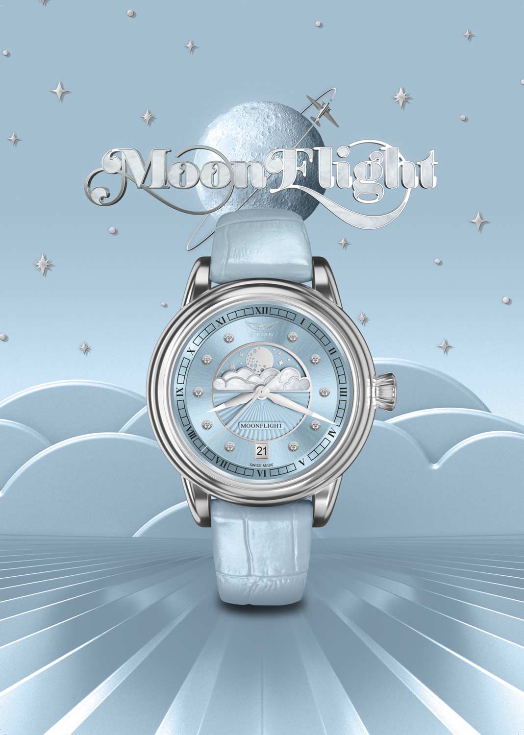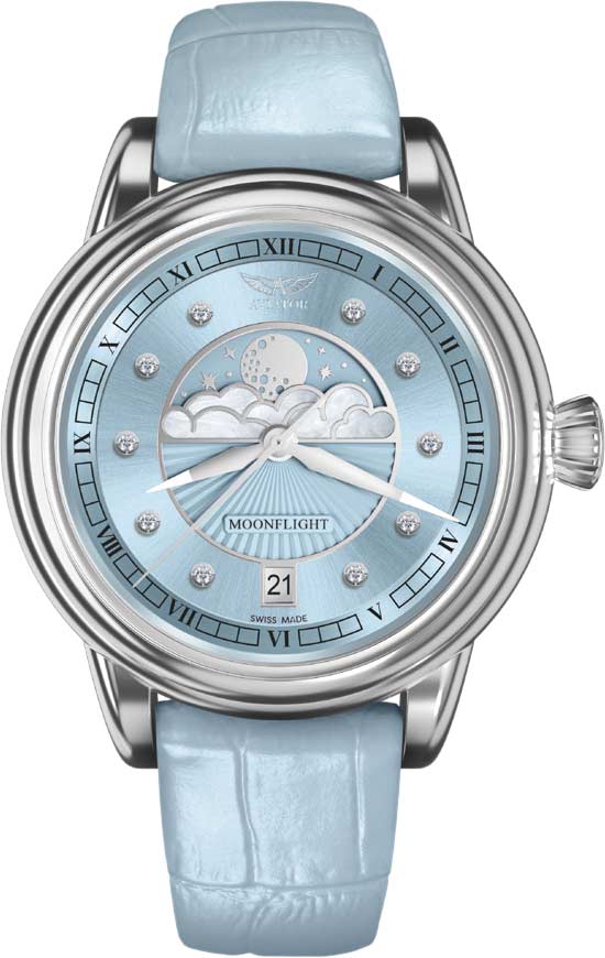 Женские кварцевые часы. Лимитированная серия — 950 экземпляров. В механизме 13 камней. Круглый стальной корпус. Циферблат выполнен по технологии Sunray (солнечные лучи). Облака на циферблате украшены перламутровыми вставками. Метки в виде точек инкрустированы бриллиантами.