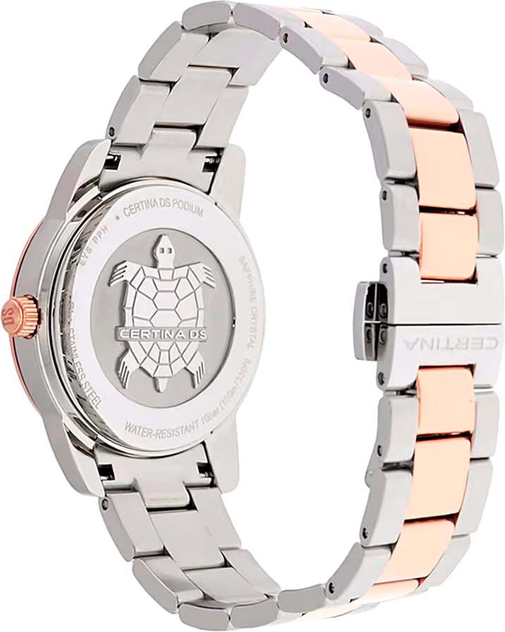 Задняя крышка украшена рельефным символом бренда — панцирем черепахи, символизирующим надежность и долговечность. Надежный стальной браслет с раскладывающейся застежкой.