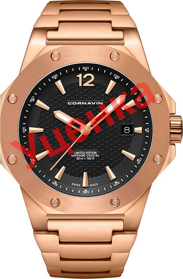 Downtown 3-H. Лимитированная серия - 999 экземпляров. Круглый корпус изготовлен из нержавеющей стали с прочным сапфировым стеклом. Эффектный восьмигранный безель украшен стильными винтами. Циферблат декорирован узором сотовой структуры и логотипом Cornavin. Заостренные прямоугольные часовая и минутная стрелки с частично удаленным металлом покрыты фирменным люминесцентным составом Super-LumiNova, который светится в темноте. Метки в виде штрихов и арабской цифры 12. Окошко даты находится в положении 3 часа. Рифленая заводная головка с защитой. Завинчивающаяся задняя крышка. Надежный стальной браслет с раскладывающейся застежкой.