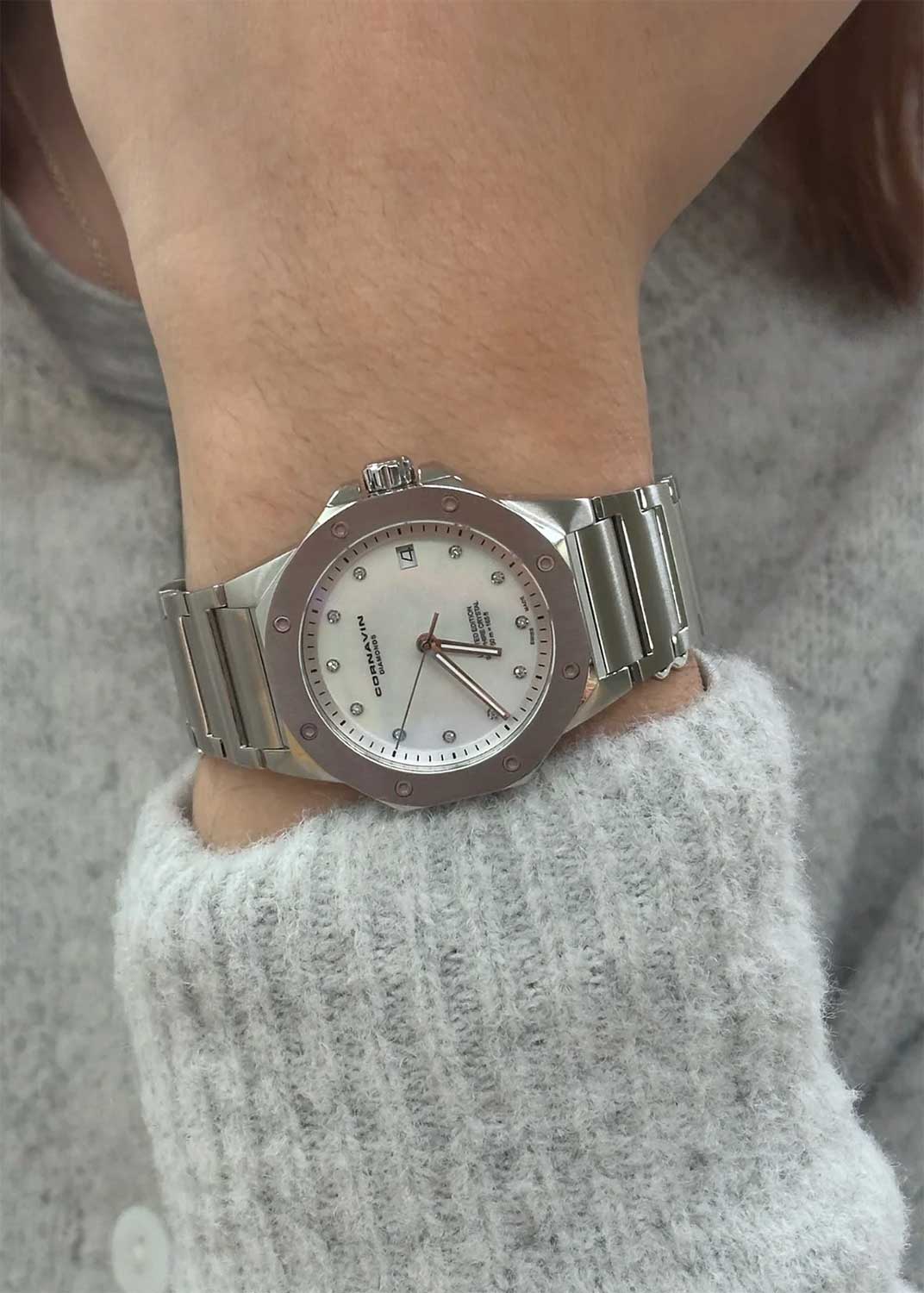 Перламутровый циферблат с метками в виде точек декорирован логотипом Cornavin в положении 12 часов. Стрелки с люминесцентным покрытием, которое светится в темноте после непродолжительной зарядки на свету.
