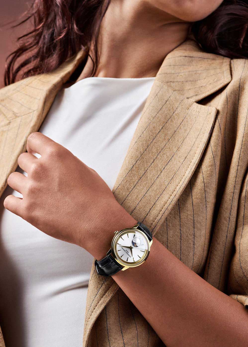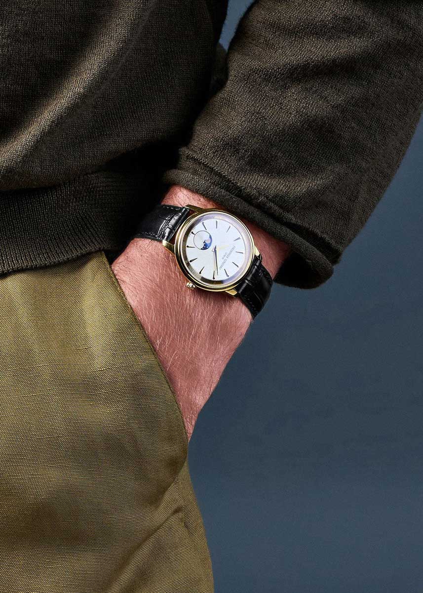 Накладные метки в виде штрихов. Стальные отполированные клиновидные стрелки в стиле Dauphine. Индикатор фаз Луны находится в положении 6 часов. Сапфировое антибликовое с двух сторон стекло.Рифленая заводная головка. Стальная задняя крышка. Удобный кожаный ремешок с классической застежкой и системой быстрой замены.
