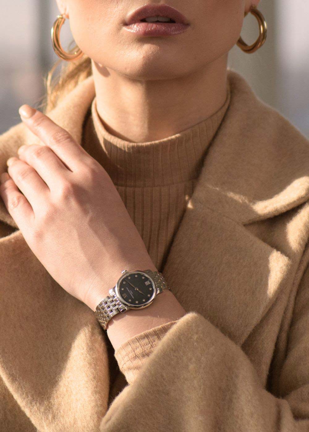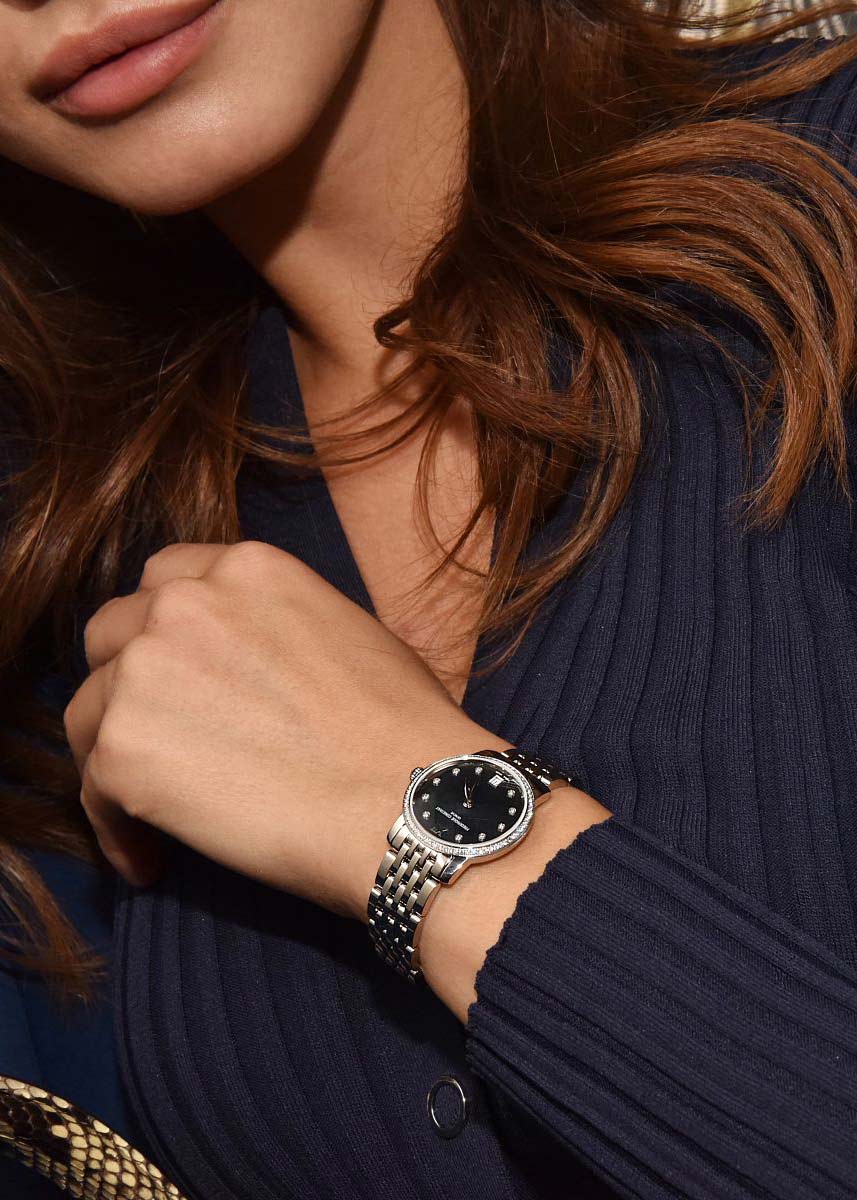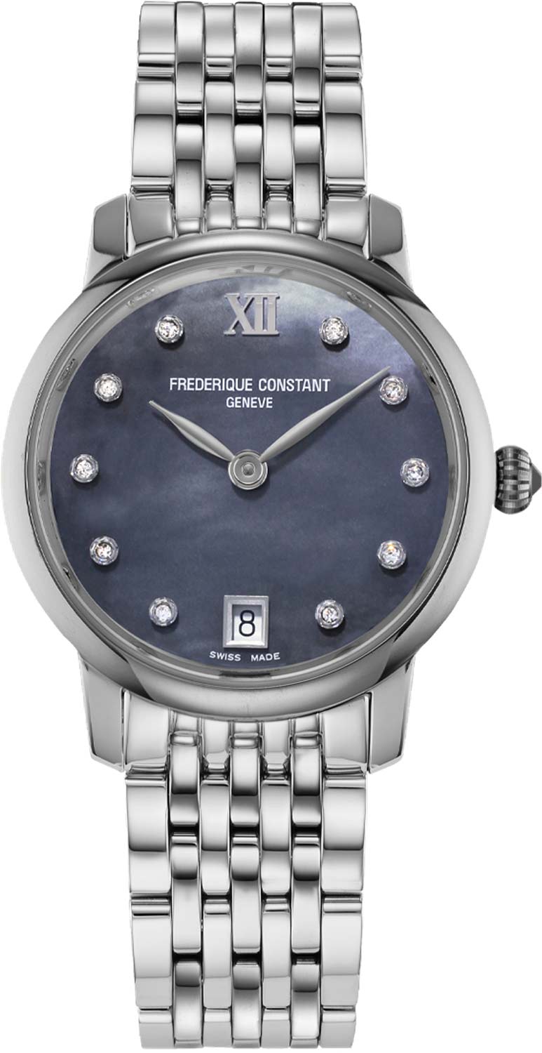 Женские наручные часы Classics Slimline Ladies. Механизм работает от батарейки. Кварцевый кристалл регулирует время с точностью до 15 секунд в месяц. Круглый стальной корпус. Перламутровый циферблат. Метки в виде точек, инкрустированных бриллиантами, и римской цифры XII. Секундная стрелка отсутствует.