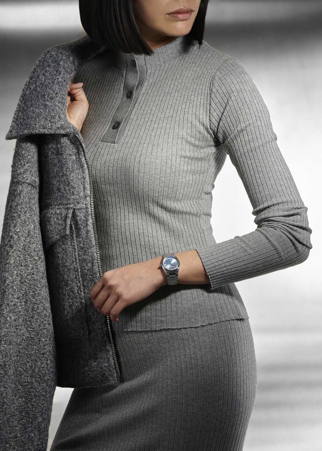 Круглый стальной корпус. Циферблат выполнен по технологии Sunray (солнечные лучи) и защищен прочным сапфировым стеклом. Накладные метки в виде штрихов и точек с бриллиантами. Окошко даты находится в положении 3 часа.