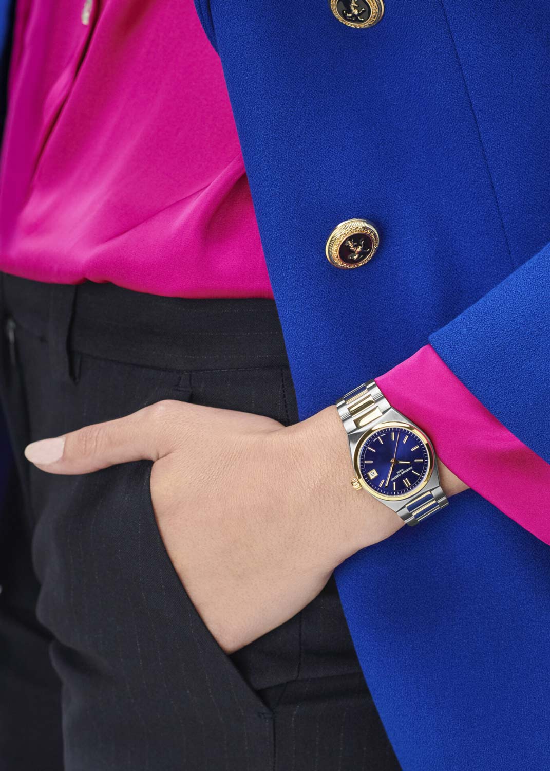 Окошко даты находится в положении 3 часа. Рифленая заводная головка. Задняя крышка крепится на 4-х винтах. Браслет с раскладывающейся застежкой и системой быстрой замены. В комплекте сменный каучуковый ремешок.