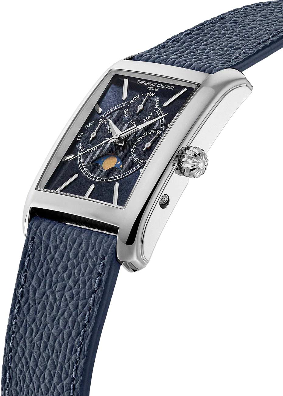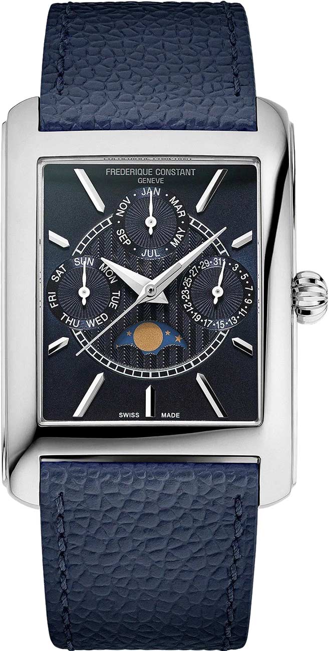 Прямоугольный стальной корпус. Циферблат с метками в виде штрихов частично выполнен по технологии Sunray (солнечные лучи). Центральная часть циферблата украшена узором гильоше. Часы обладают усложненным кварцевым механизмом: три дополнительных циферблата отображают число, день недели и месяц. Индикатор фаз Луны находится в положении 6 часов.
