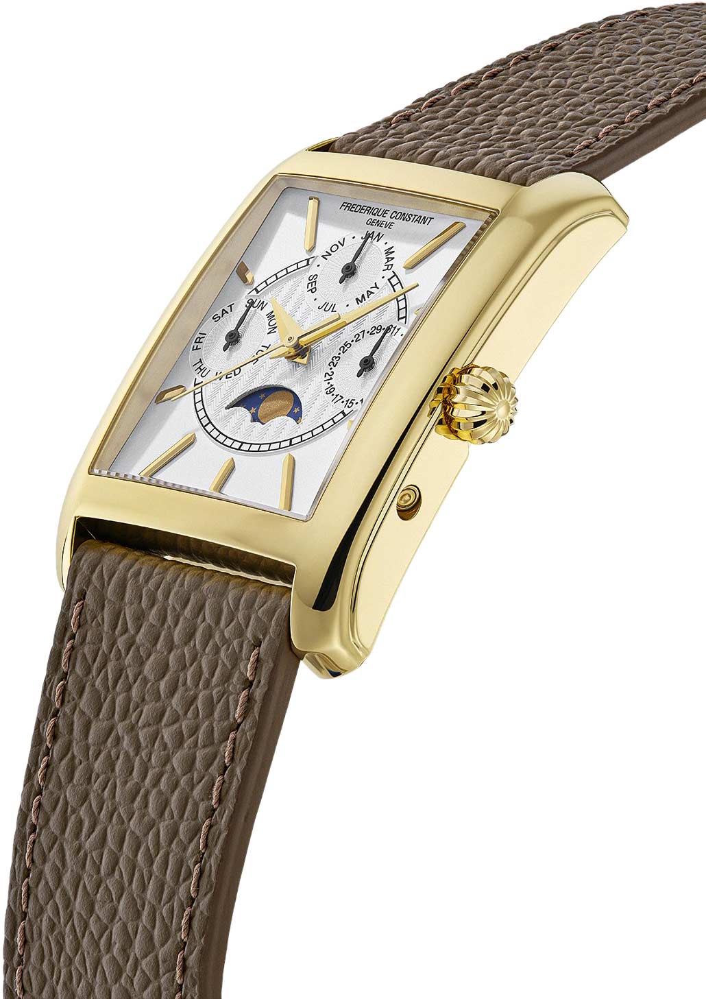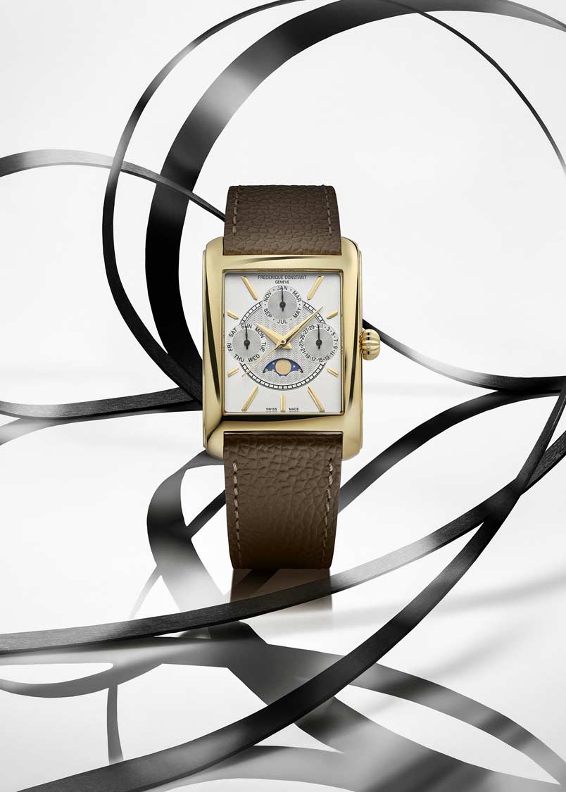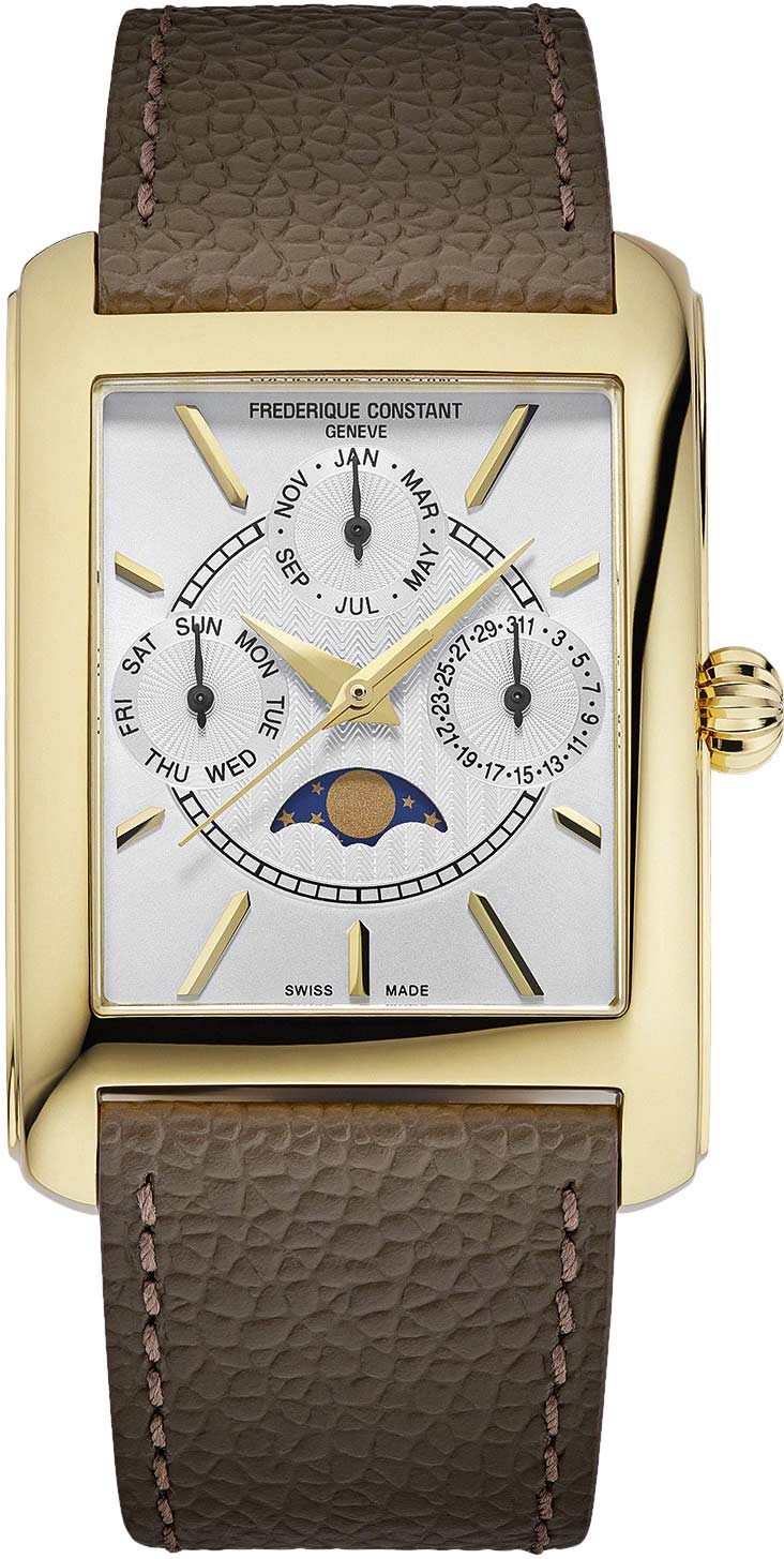 Прямоугольный стальной корпус. Циферблат с метками в виде штрихов частично выполнен по технологии Sunray (солнечные лучи). Центральная часть циферблата украшена узором гильоше. Часы обладают усложненным кварцевым механизмом: три дополнительных циферблата отображают число, день недели и месяц. Индикатор фаз Луны находится в положении 6 часов.