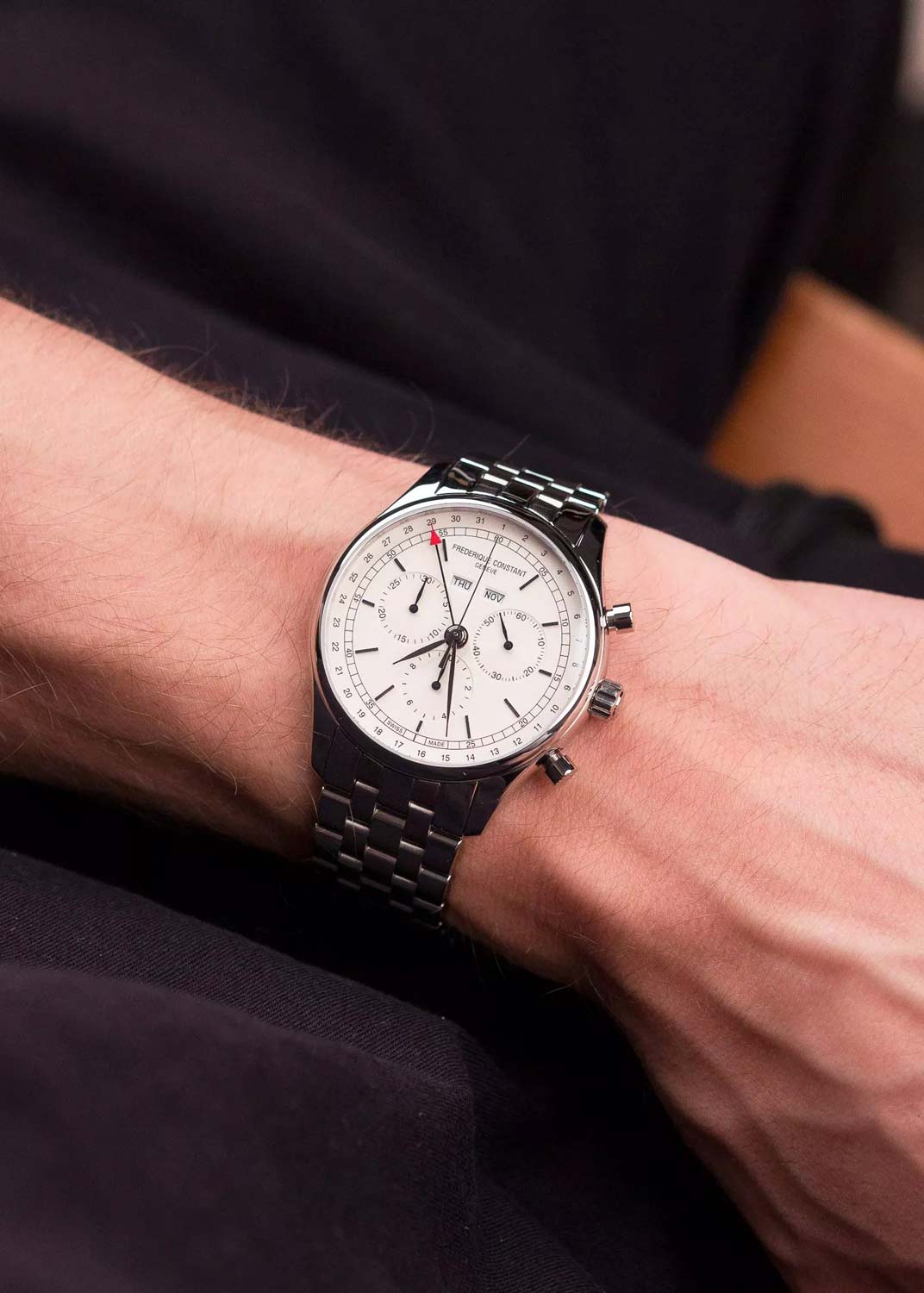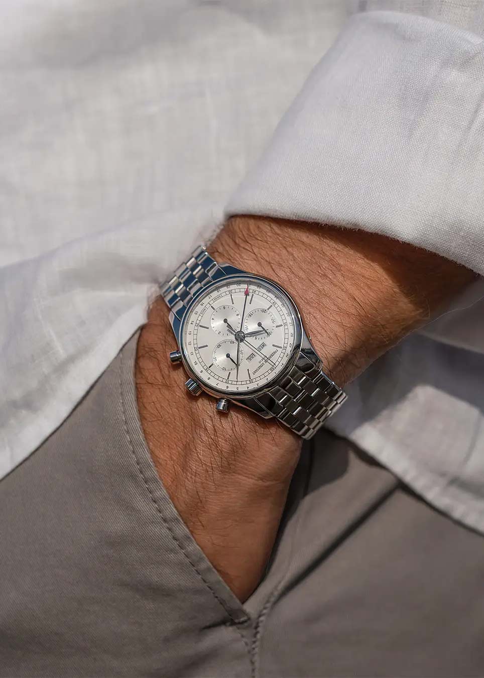 Мужские часы-хронограф с секундомером Classics Quartz Chronograph Triple Calendar. В механизме 13 камней. Батарейка рассчитана на 54 месяца. Круглый стальной корпус. Циферблат с накладными метками в виде штрихов защищен прочным сапфировым стеклом.