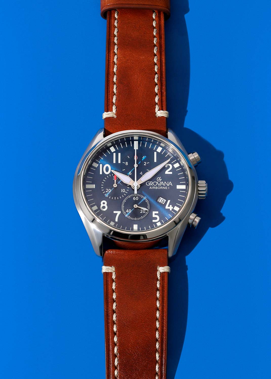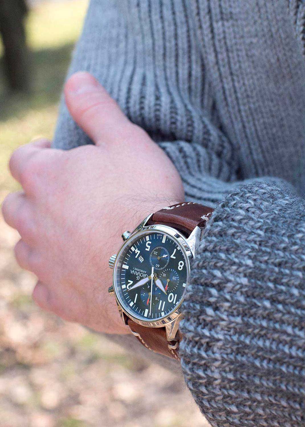 Мужские наручные авиаторские часы-хронограф. Круглый стальной корпус с матовой и полированной отделкой. Матовый циферблат. Метки в виде арабских цифр и штрихов. Мечевидные стрелки в стиле Sword.