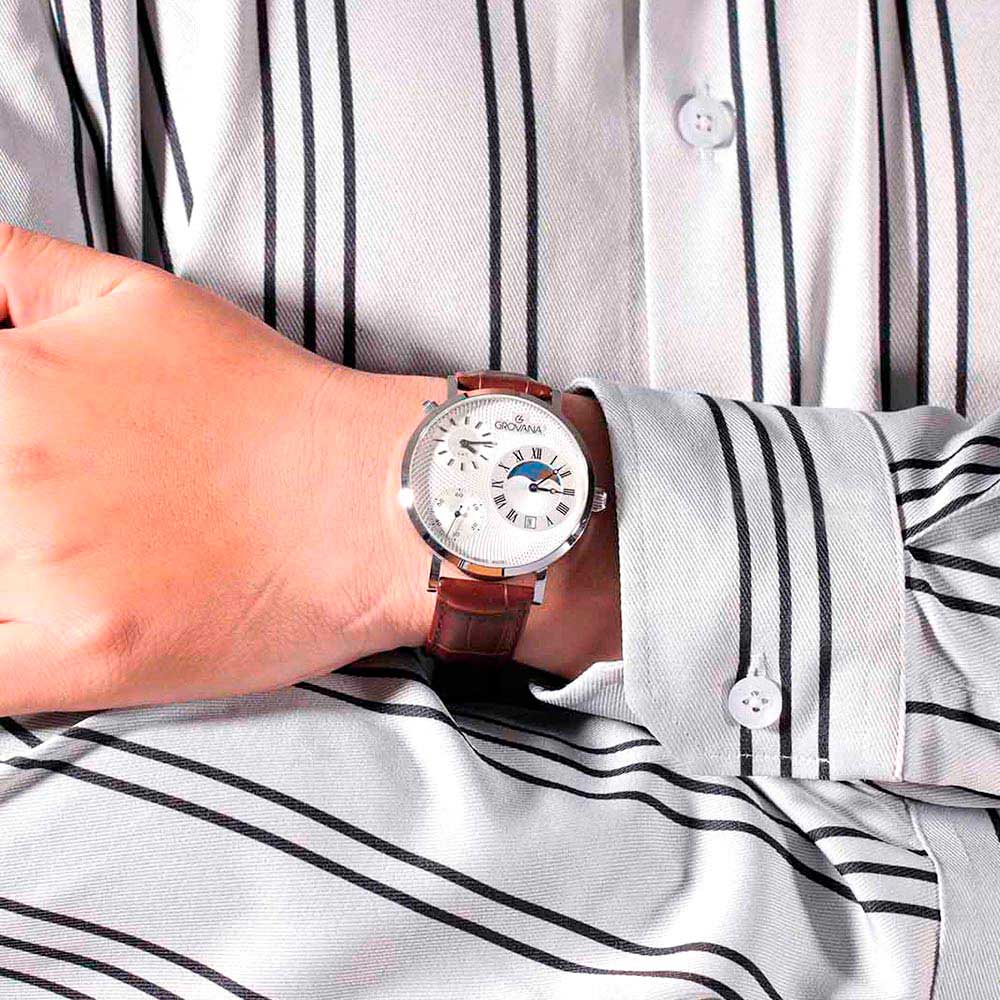 Функциональные наручные мужские часы. Круглый стальной корпус с полированной отделкой. Циферблат с узором гильоше. Два механизма. Второй часовой пояс. Секундная стрелка вынесена на отдельный циферблат.